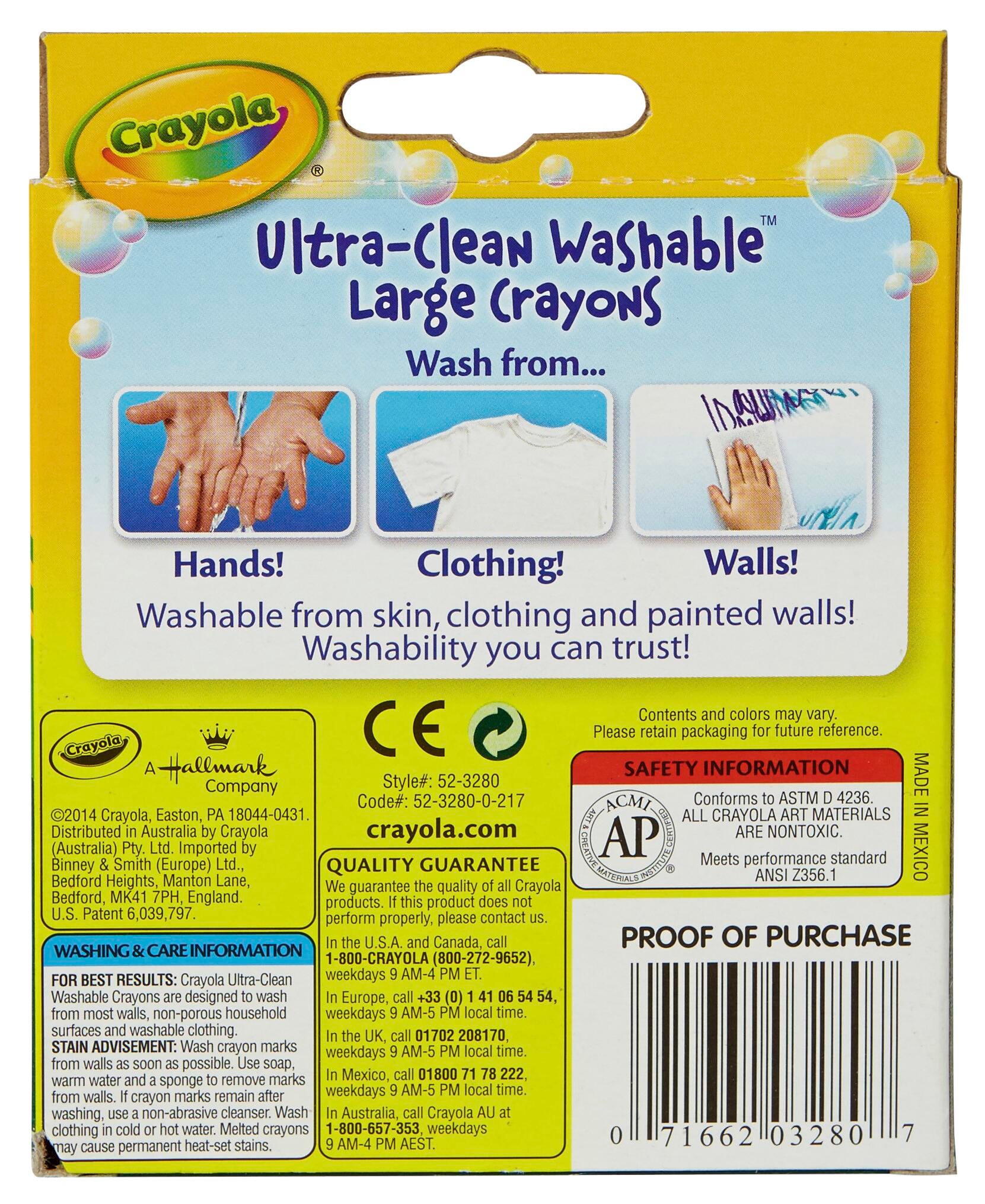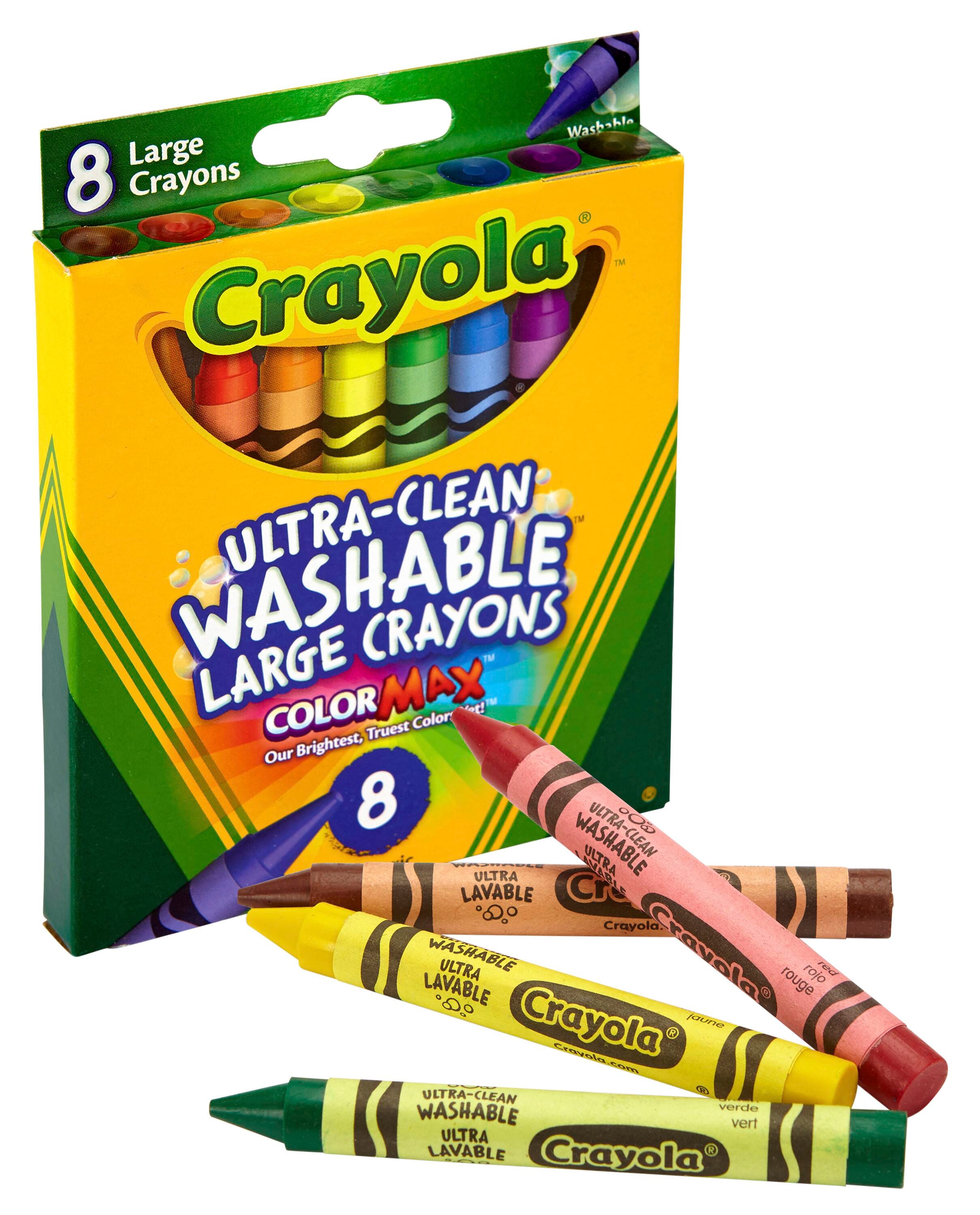 Crayola Ultra-Clean Washable Crayons are specially formulated to wash clean from skin, clothing, and painted walls. Box contains a variety of colors, from classic to bright, and features ColorMax, making them the brightest, truest colors yet. Large size crayons measures 4 x 7/16 inches and are easier for young children to hold. AP certified non-toxic.Features