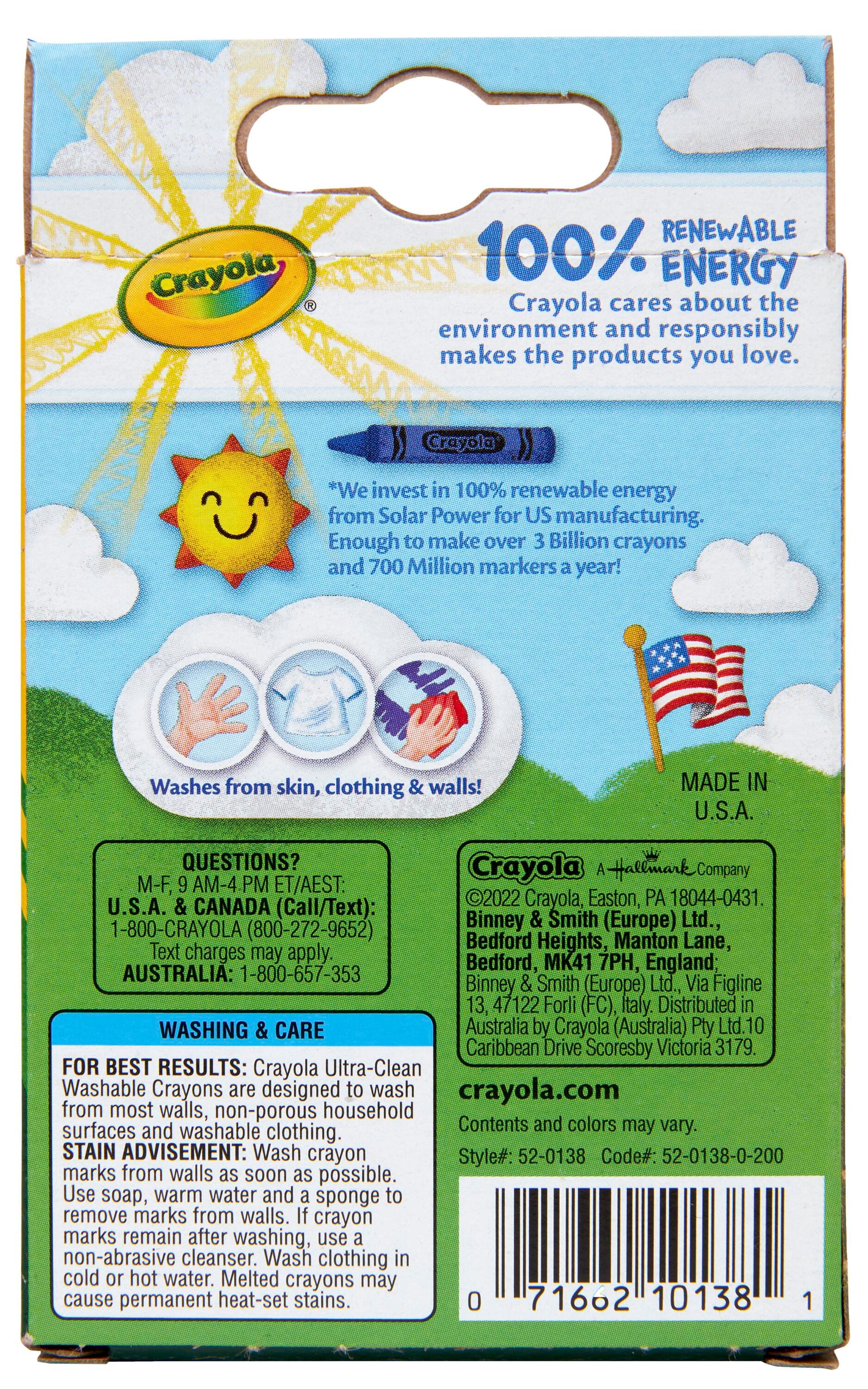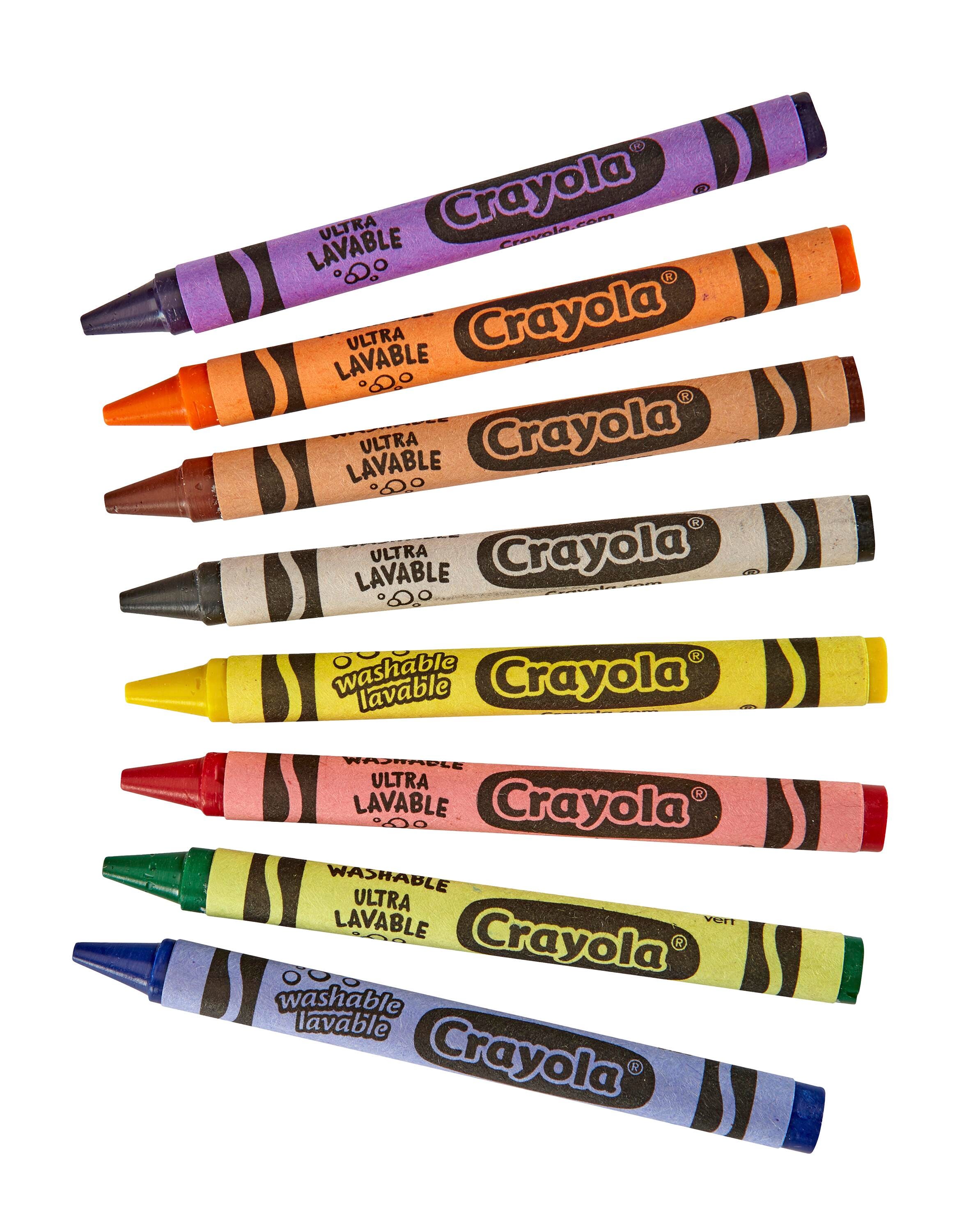 Ultra-Clean Washable Crayons from Crayola deliver fun shades that inspire self-expression and imaginative play. They are specially formulated to clean off skin, clothing, and painted walls.