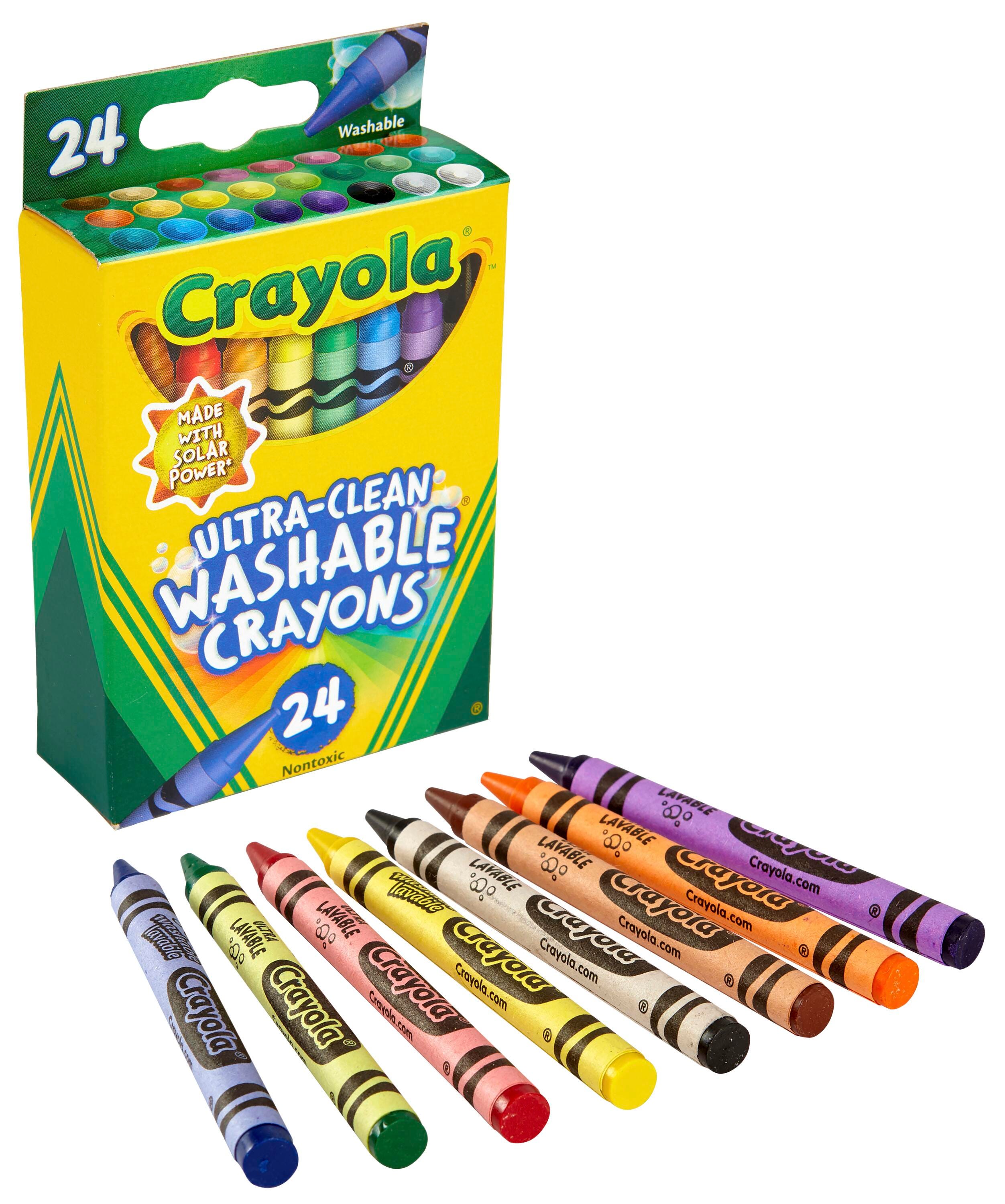 This box of Crayola Ultra-Clean Washable Crayons delivers the classic art tool that students and teachers love, now with improved washability. Specially formulated to wash clean from skin, clothing, and painted walls, these child-friendly crayons provide hours of colorful fun, with bold and true color, a smooth formula, and a durable construction. This pack contains 24 crayons in assorted colors.Features