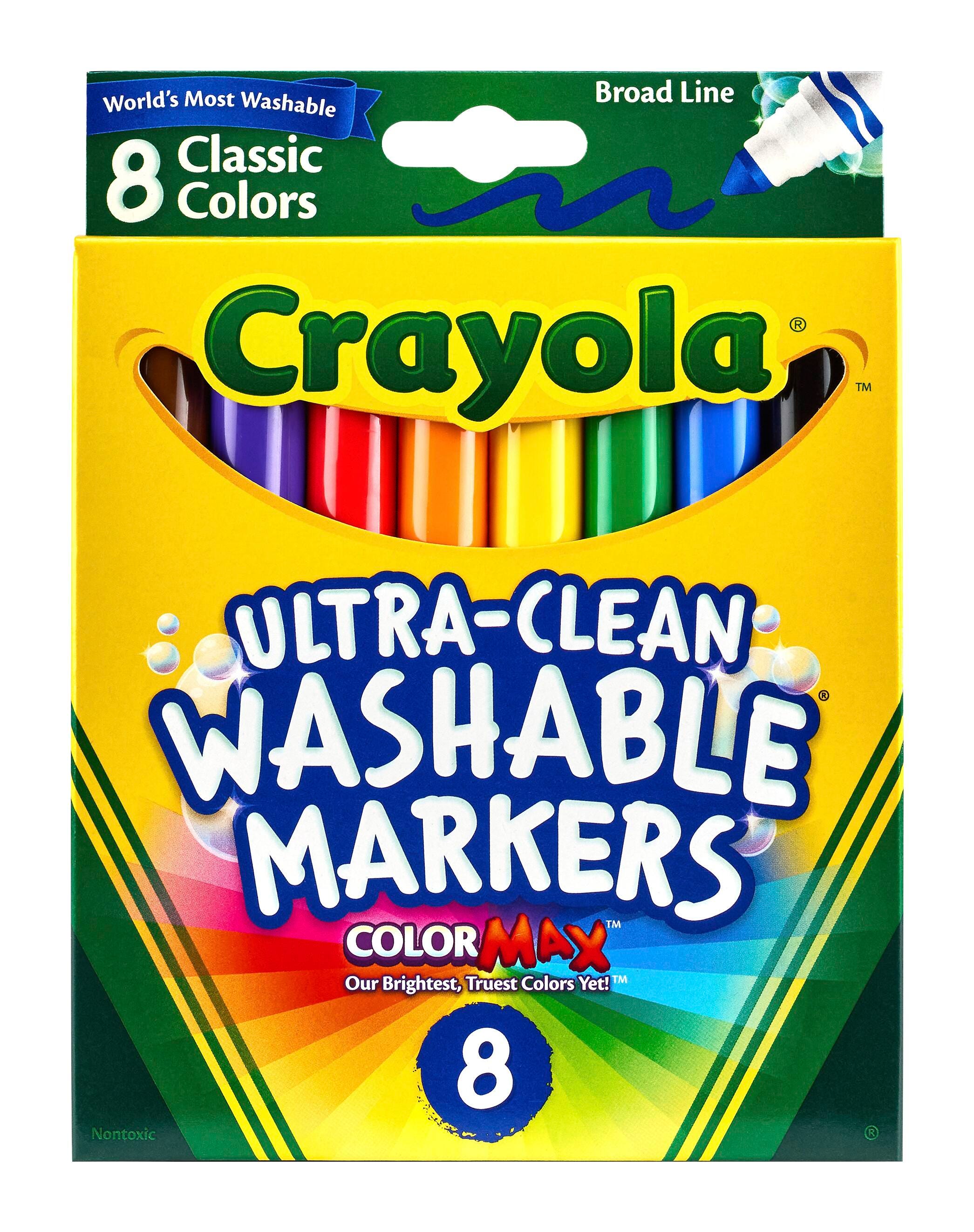 Bring home the most washable marker in the world! The Crayola Ultra-Clean Washable Markers now come complete with ColorMax to ensure the truest and brightest colors possible. These markers have a broad-line tip that lays down bold strokes that are great for coloring, drawing, and writing. The Ultra-Clean formula keeps the bold colors where you want them, making it easy to wash stray marks from skin, clothing, and even walls. This set comes with 8 markers, 1 each of the following colors: black, blue, brown, green, orange, red, violet, and yellow.Features