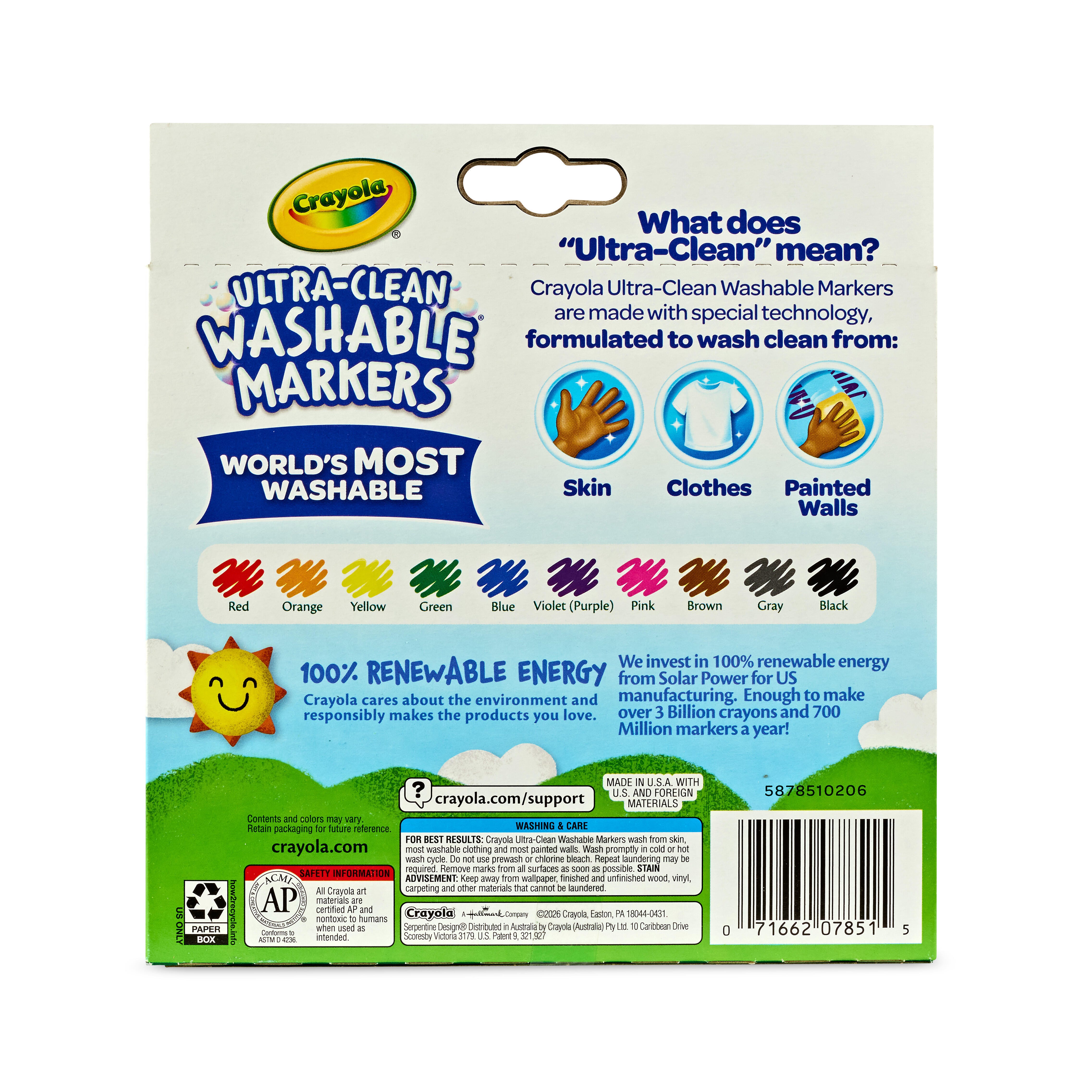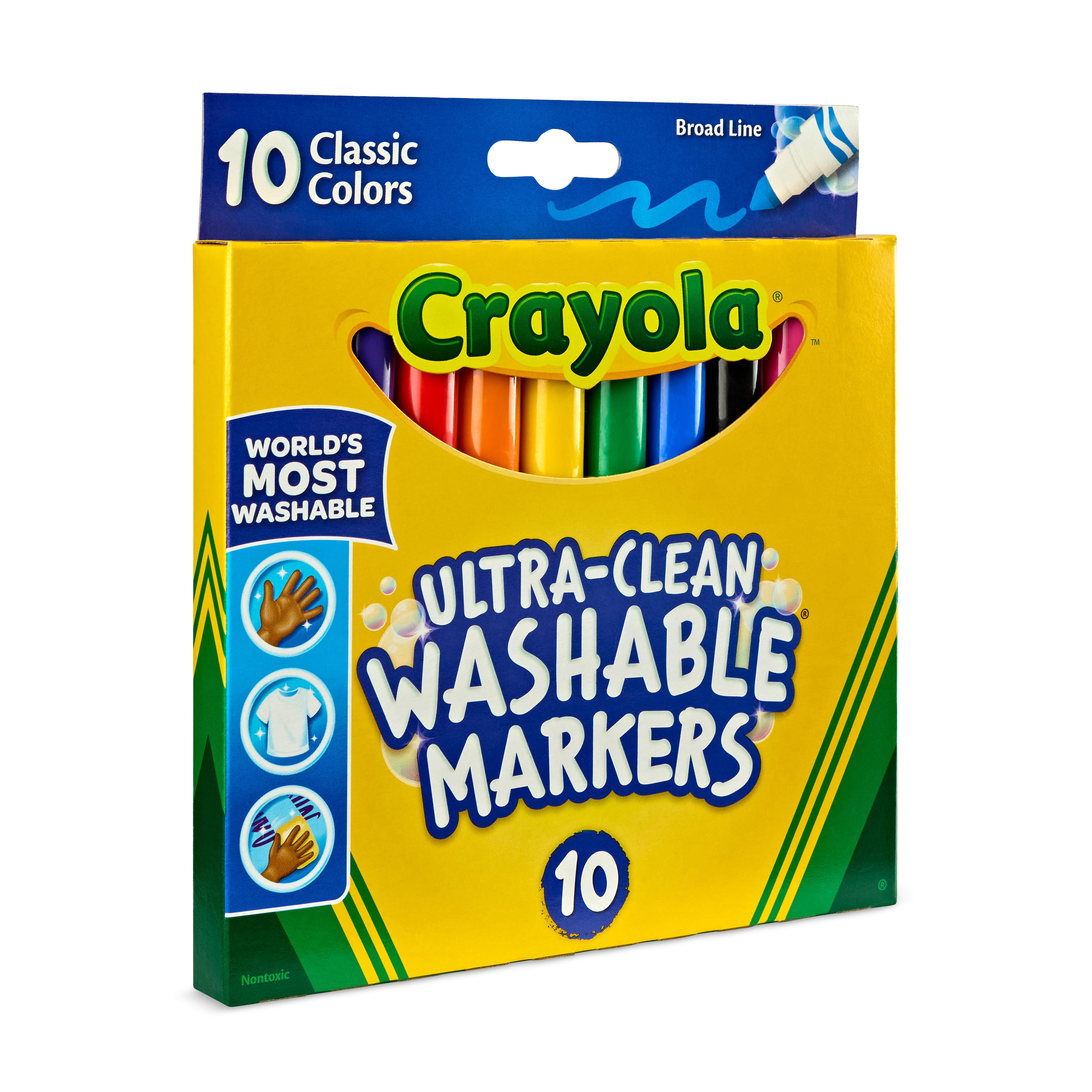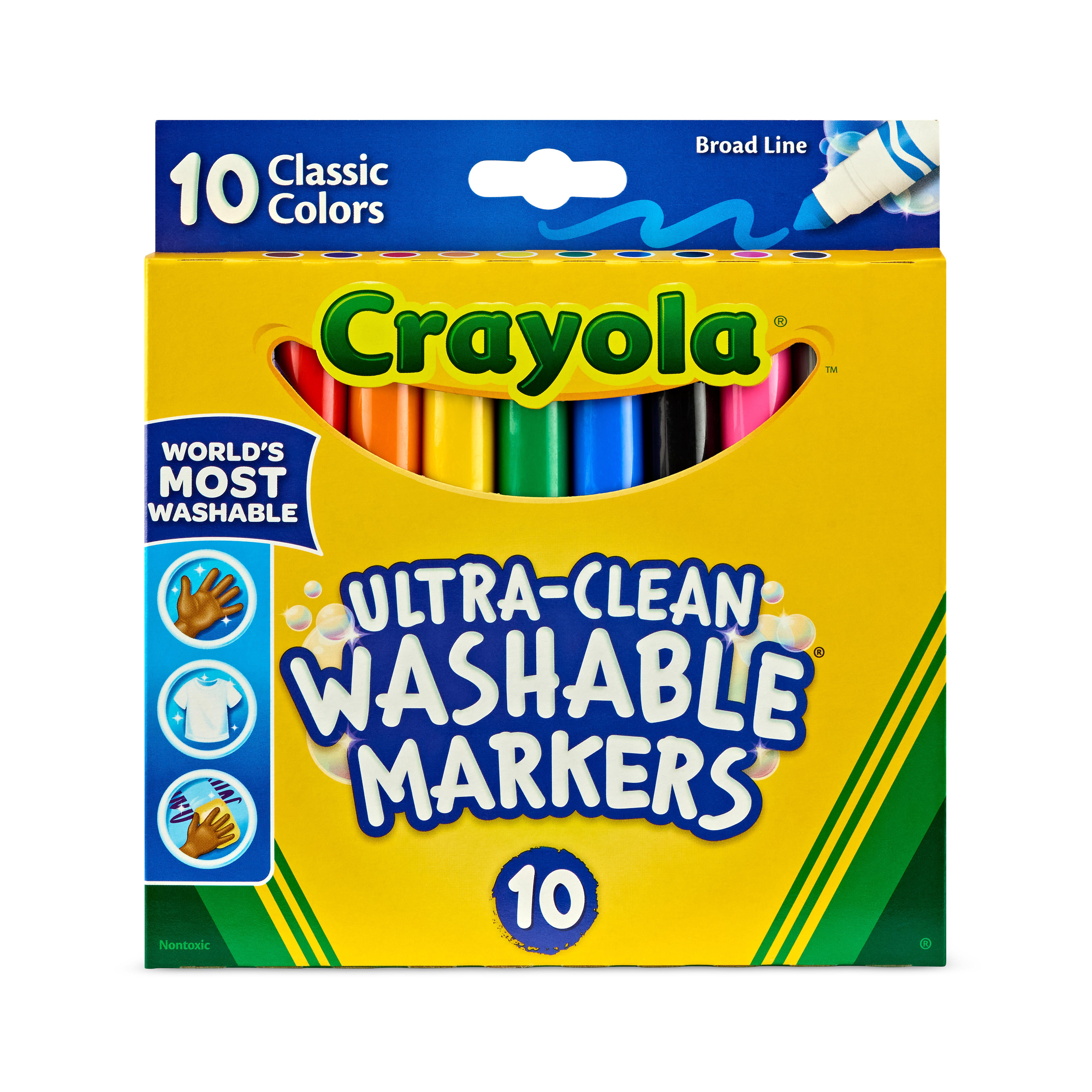 Bring home the most washable marker in the world! These Crayola Ultra-Clean Washable Markers have a broad-line tip that lays down bold strokes that are great for coloring, drawing, and writing. The Ultra-Clean formula keeps the bold colors where you want them, making it easy to wash stray marks from skin, clothing, and even walls. This set comes with 10 markers, 1 each of the following colors: red, orange, yellow, green, blue, purple, pink, brown, black, and gray.Features