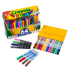 Satisfy young artists' need for more color and experimentation with this huge selection of washable Crayola Markers! This large set includes Ultra-Clean Washable Broad Liner Markers, Washable Window Markers, and Gel FX Markers that deliver fun and variety for many creative projects. The Ultra-Clean Washable Markers are perfect for drawing and coloring on paper, the Window Markers let you take your ideas to glass, and the Gel FX markers are perfect for dark-colored paper, glass, plastic, and more. The surface coloring options are truly endless! These markers are also compatible with the Crayola Marker Airbrush (sold separately) if you or your students want to add sprayed effects. A reusable flip-top box with tiered sleeves allows for easy access and storage. This set contains a total of 64 markers, including 48 Ultra-Clean Broad Line Markers, 8 Gel FX Markers, and 8 Washable Window Markers, all in an assortment of colors.Features