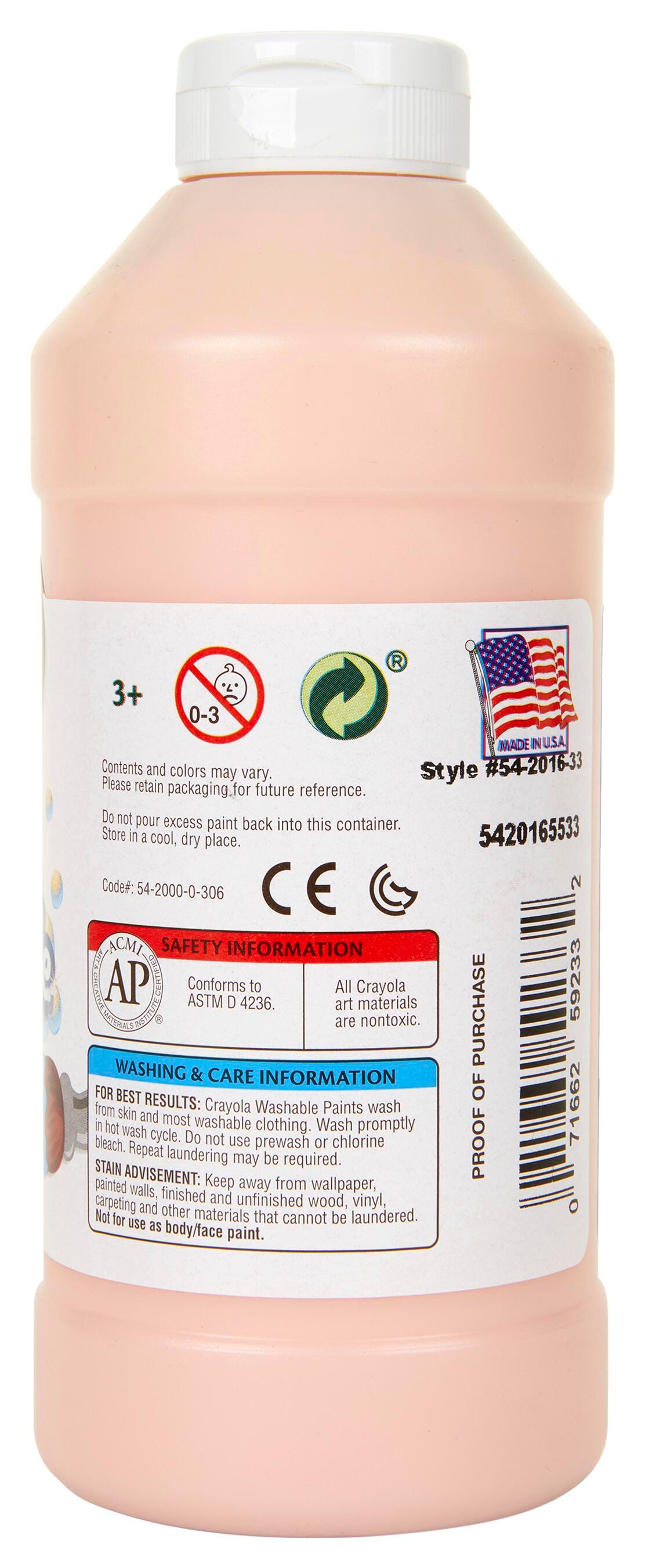 Enhance any artwork with high-quality and vibrant Crayola Washable Paint! The paint's thick, creamy consistency provides rich color and an opaque covering on most surfaces. Plus, this child-friendly paint is easily washed from skin and almost all clothing. This bright peach paint comes in a 1 pint bottle with a screw lid so it is easy to pour—great for projects in the classroom, childcare center, or home.