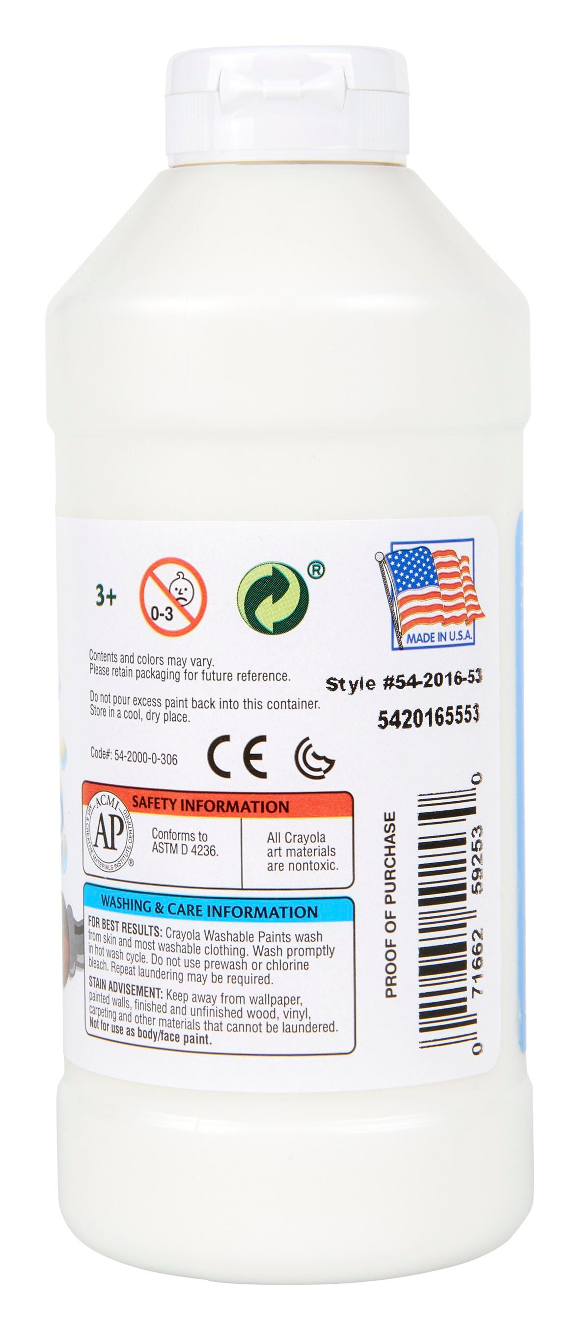 Enhance any artwork with high-quality and vibrant Crayola Washable Paint! The paint's thick, creamy consistency provides rich color and an opaque covering on most surfaces. Plus, this child-friendly paint is easily washed from skin and almost all clothing. This bright white paint comes in a 1 pint bottle with a screw lid so it is easy to pour—great for projects in the classroom, childcare center, or home.