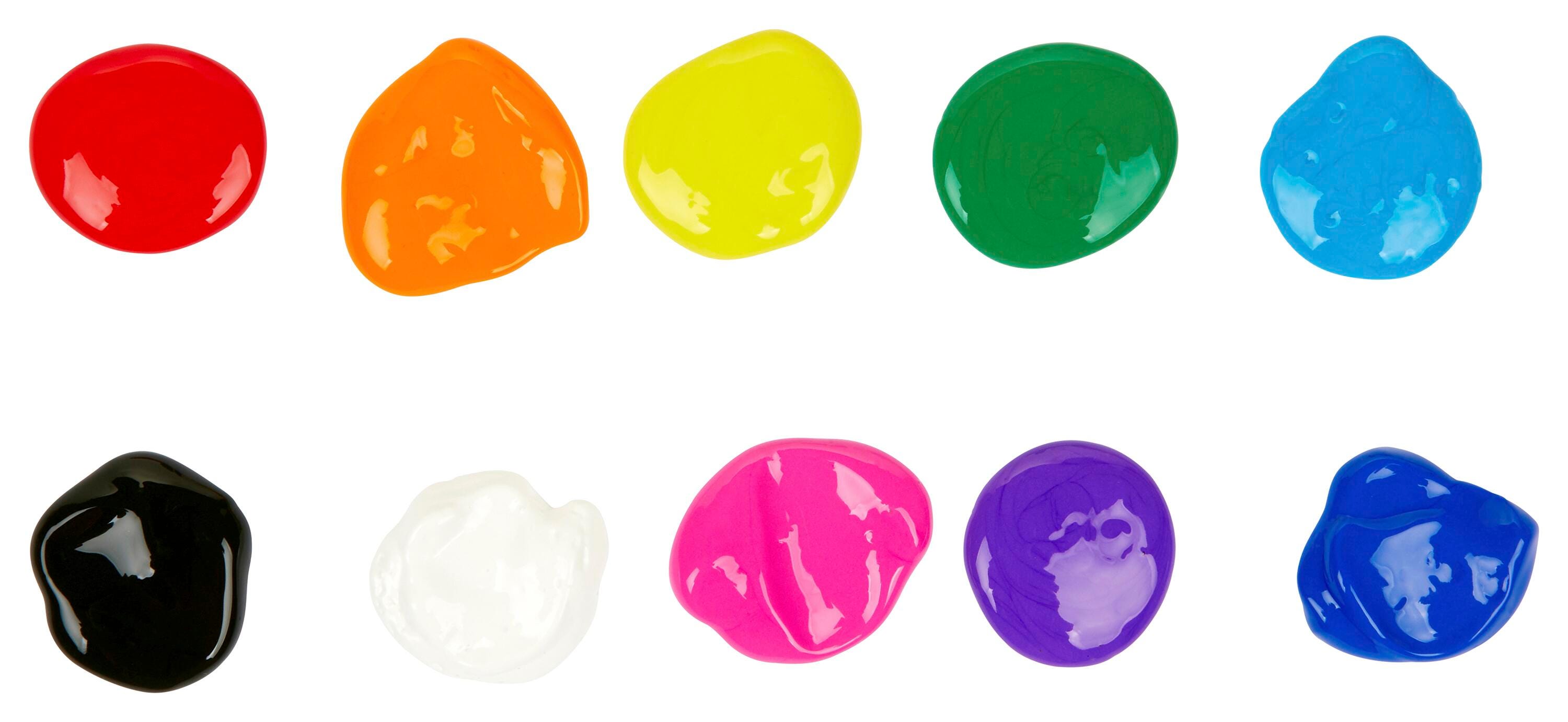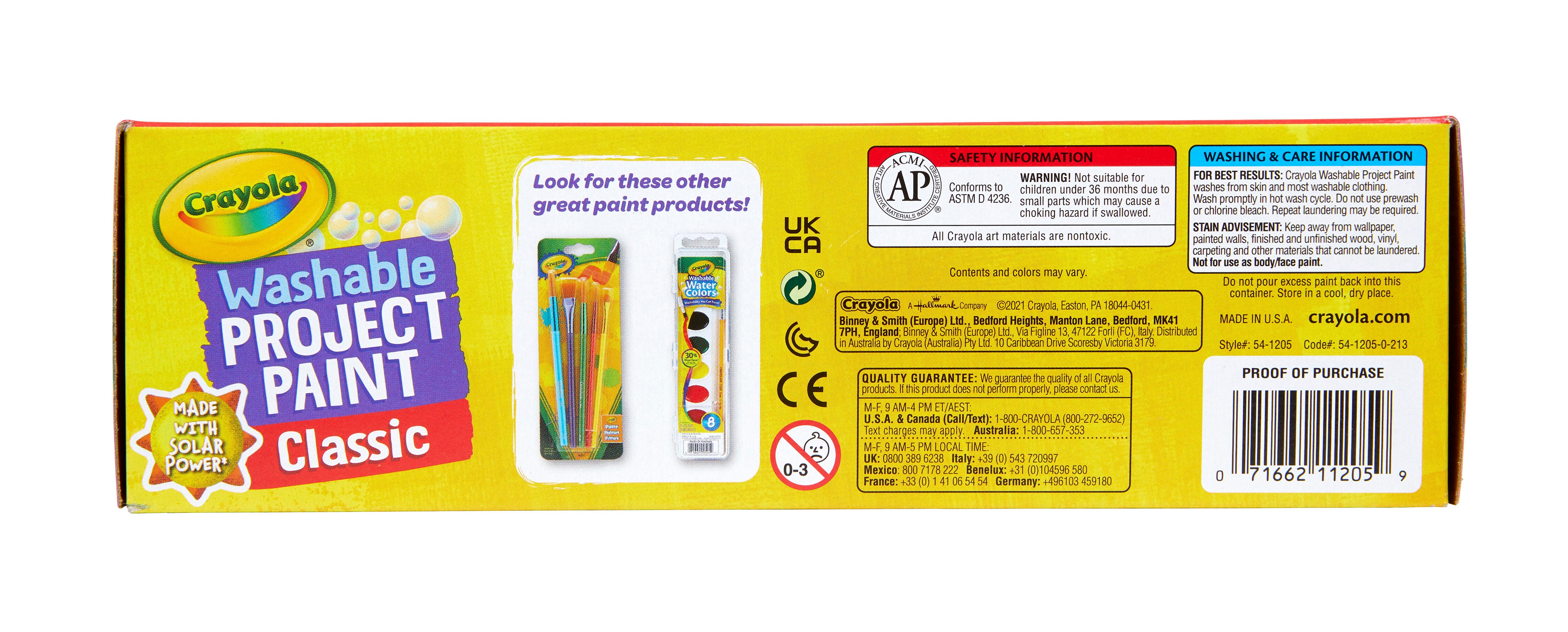 This Crayola Washable Project Paint Set is great for introducing young children to the joys of painting. This child-friendly paint has a washable formula for easy cleanup and enhanced mixing and flow characteristics for loads of creative possibilities. It can be used on a variety of surfaces including construction paper, poster board, drawing paper, cardboard tubes and boxes, paper mache, and more. This set contains ten 2 ounce bottles of paint, 1 each of the following colors: white, yellow, violet, red, orange, magenta, blue, turquoise, green, and brown.