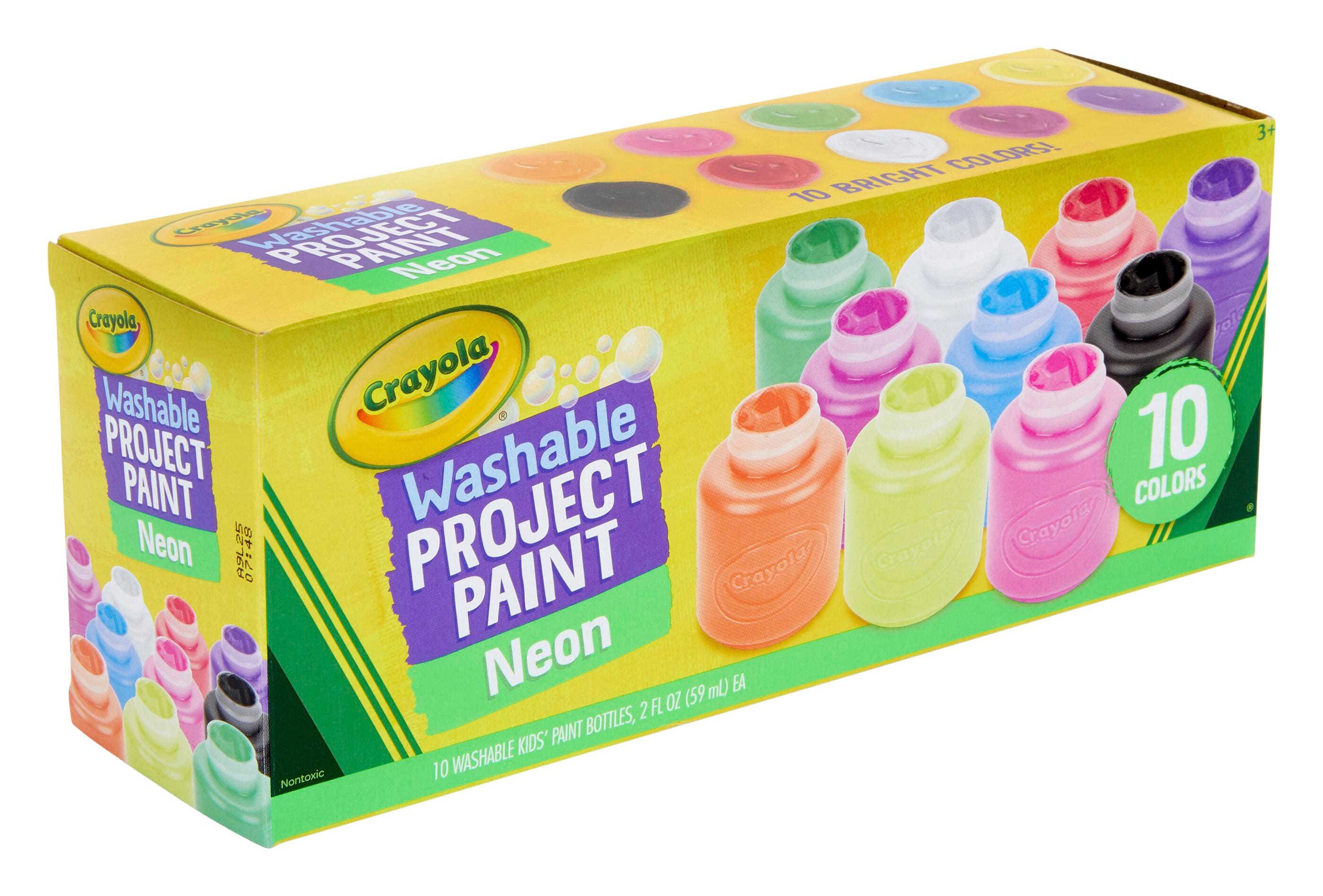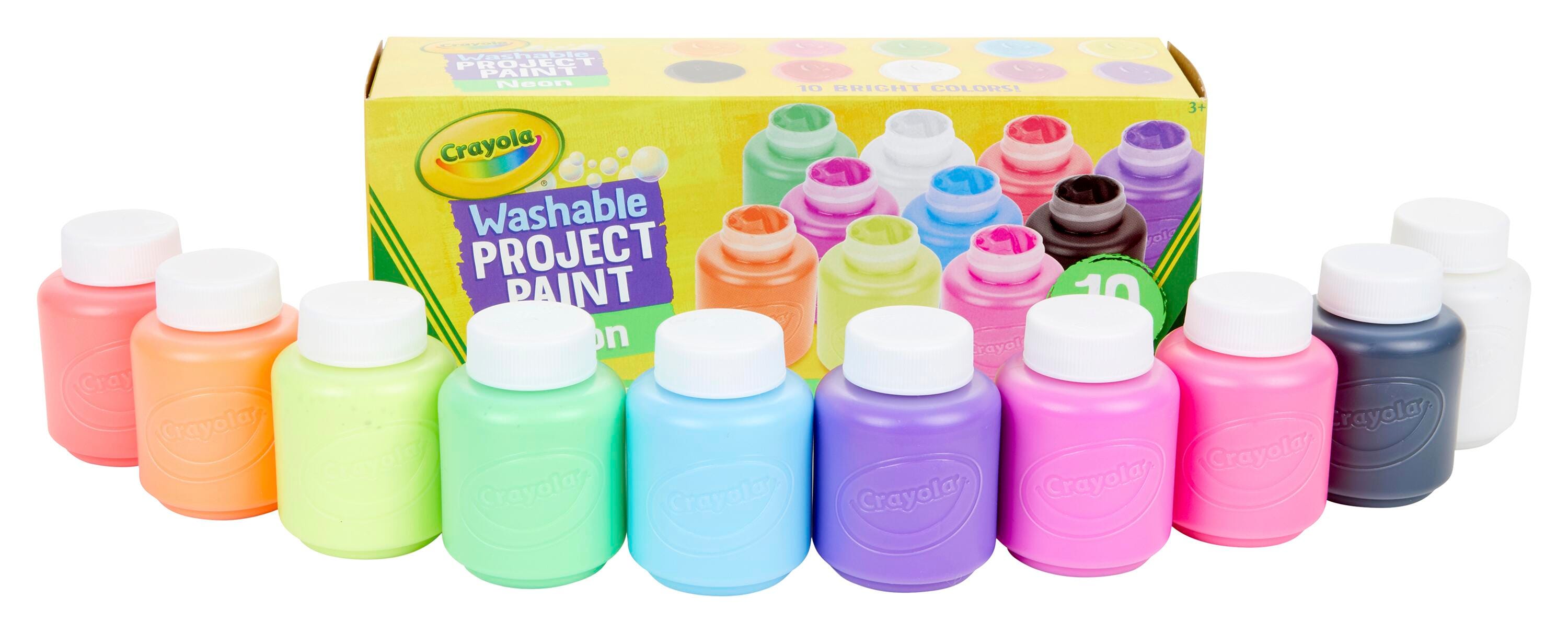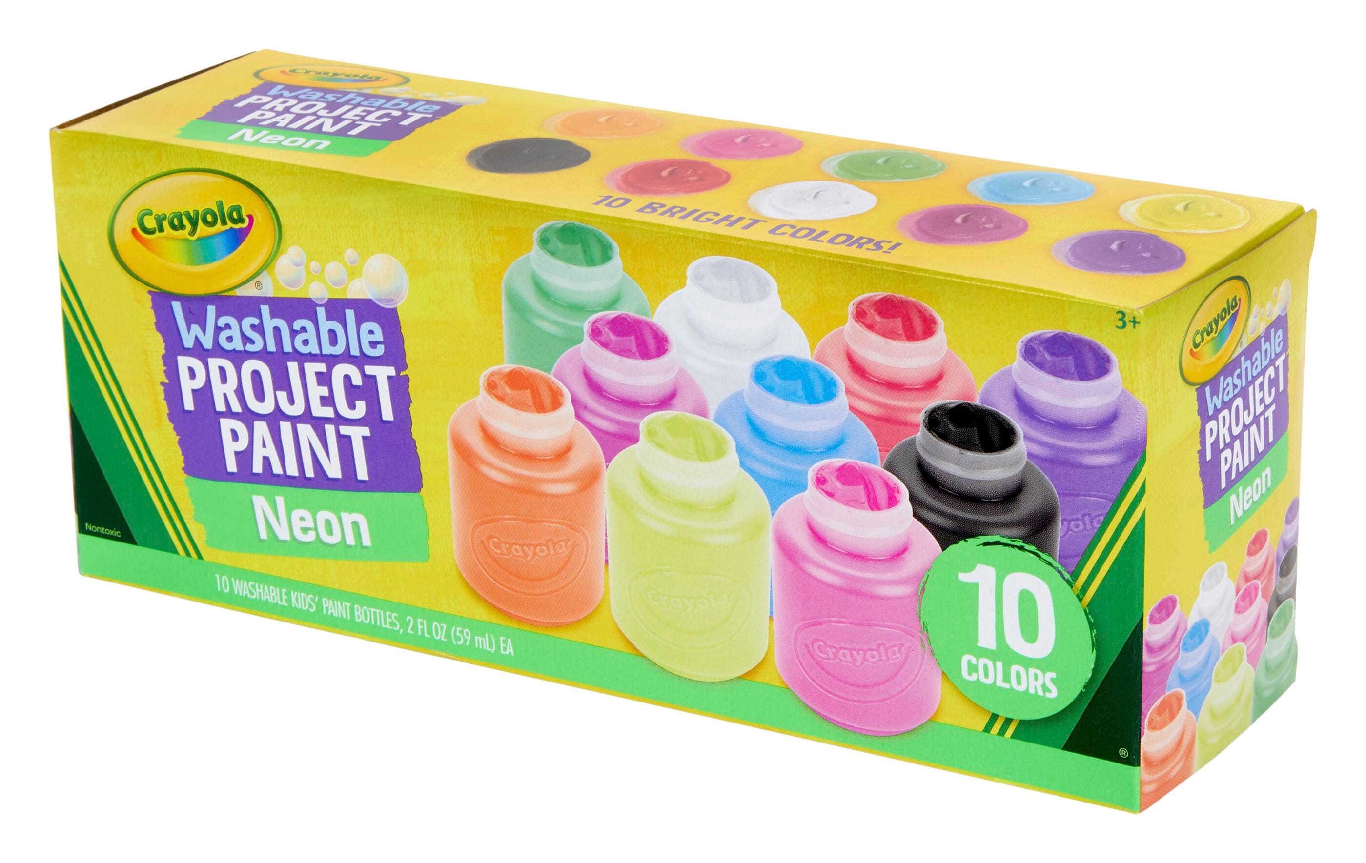 This Crayola Washable Project Paint Set is great for introducing young children to the joys of painting with vivid neon colors. This child-friendly paint has a washable formula for easy cleanup and enhanced mixing and flow characteristics for loads of creative possibilities. It can be used on a variety of surfaces including construction paper, poster board, drawing paper, cardboard tubes and boxes, paper mache, and more. This set comes with 10 bottles (2 ounces each), 1 each in the following colors: blue, red, purple, magenta, yellow, pink, green, orange, white, and black.