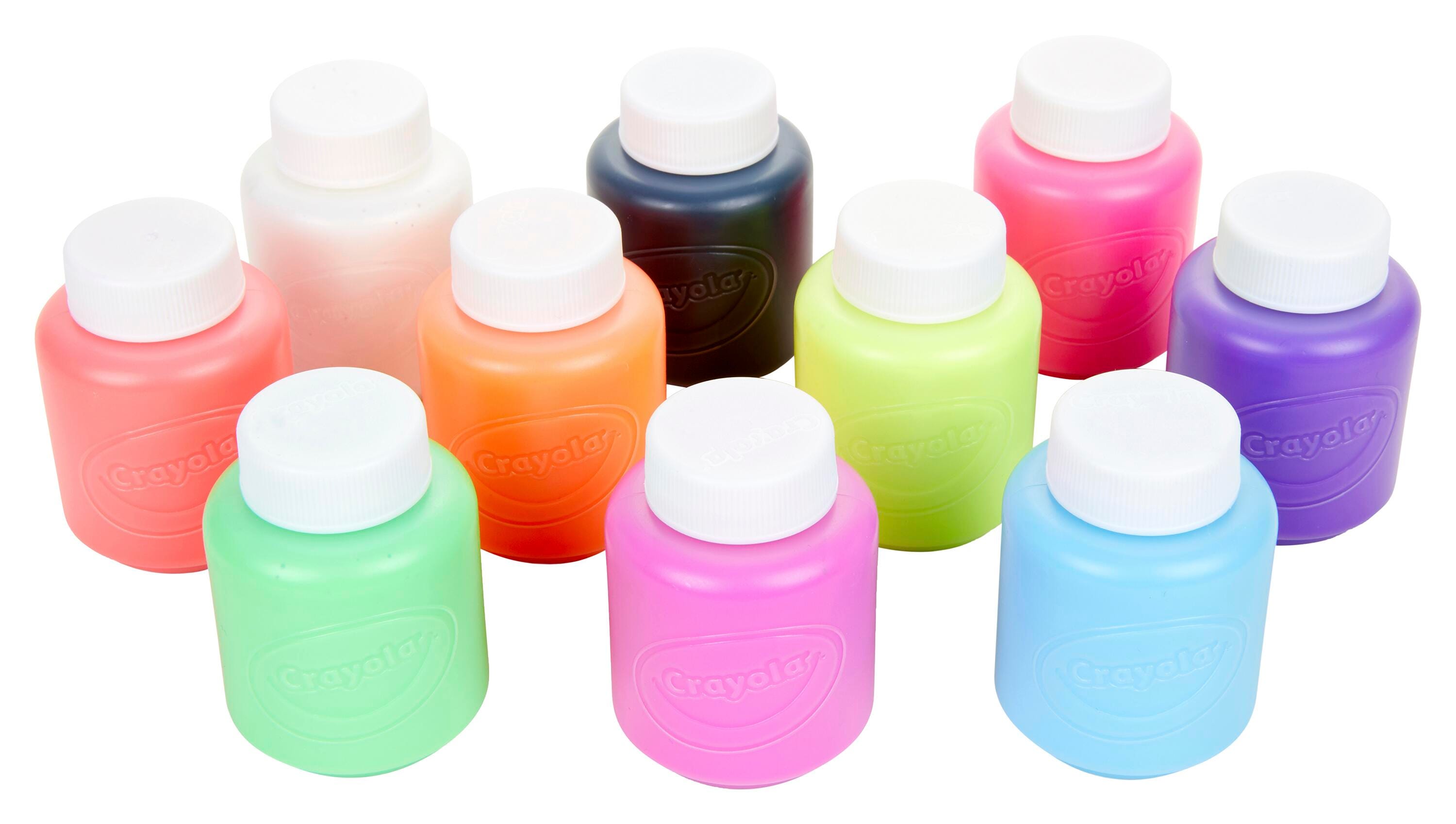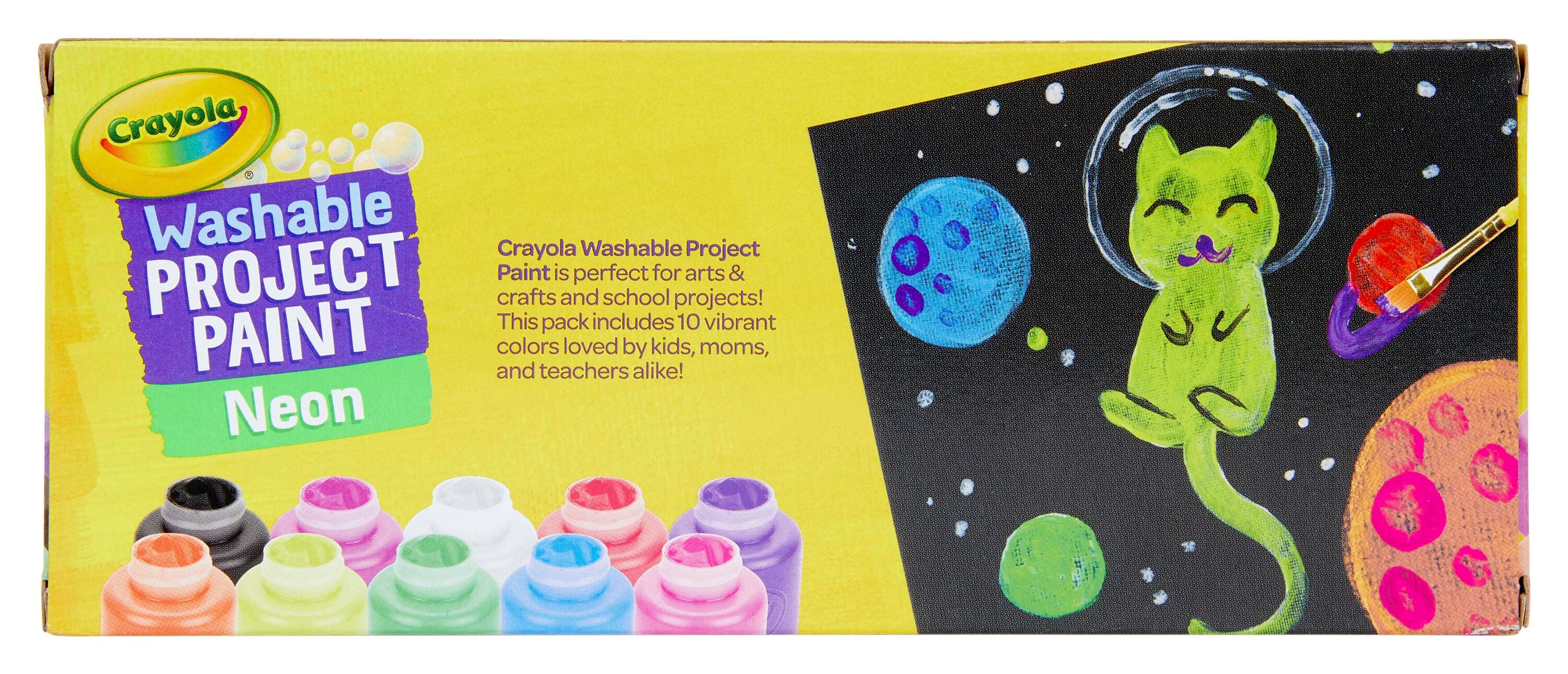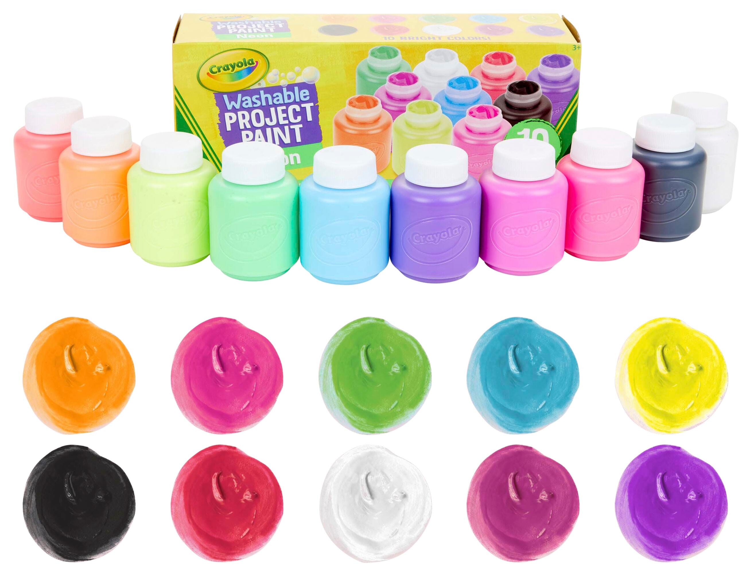 This Crayola Washable Project Paint Set is great for introducing young children to the joys of painting with vivid neon colors. This child-friendly paint has a washable formula for easy cleanup and enhanced mixing and flow characteristics for loads of creative possibilities. It can be used on a variety of surfaces including construction paper, poster board, drawing paper, cardboard tubes and boxes, paper mache, and more. This set comes with 10 bottles (2 ounces each), 1 each in the following colors: blue, red, purple, magenta, yellow, pink, green, orange, white, and black.