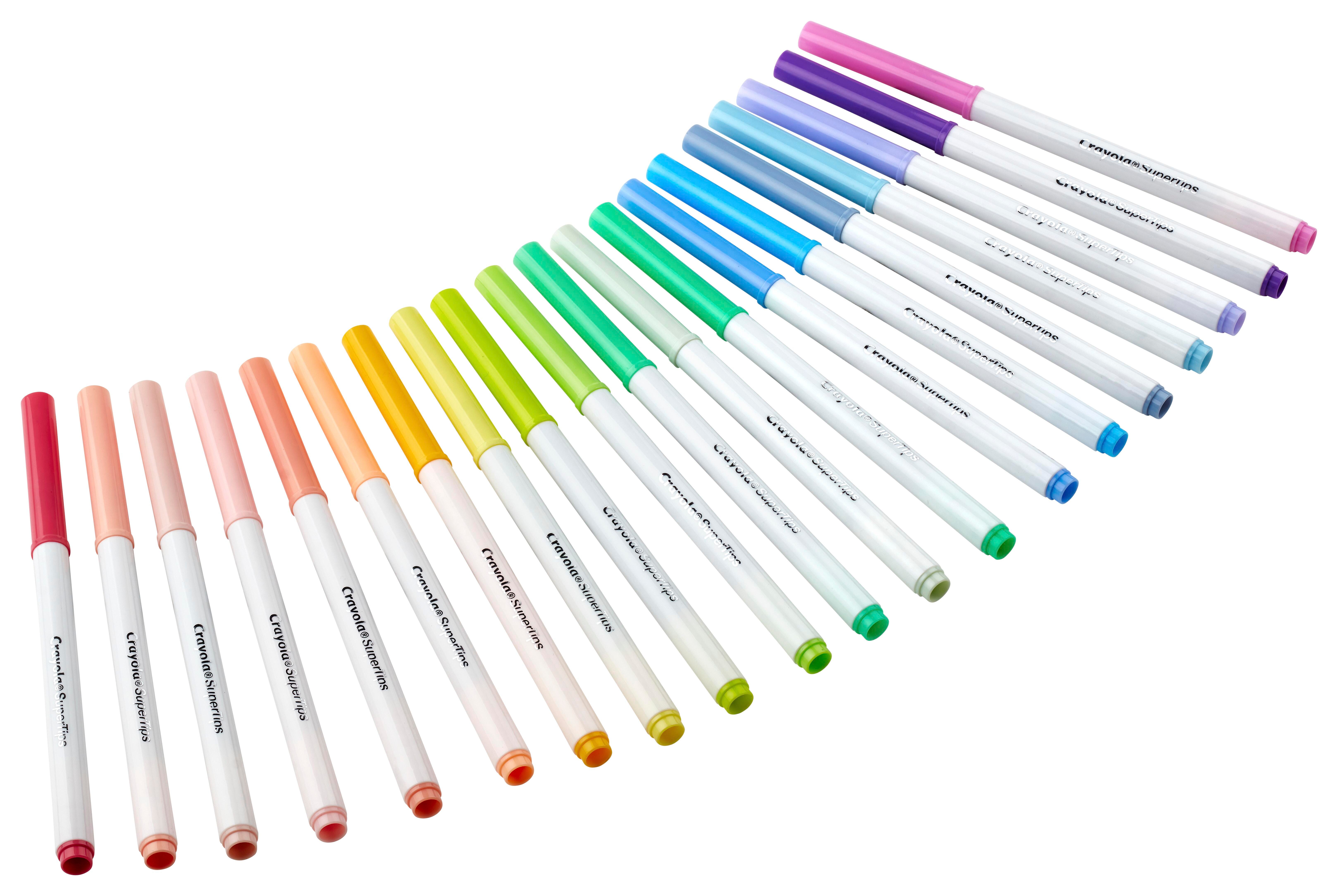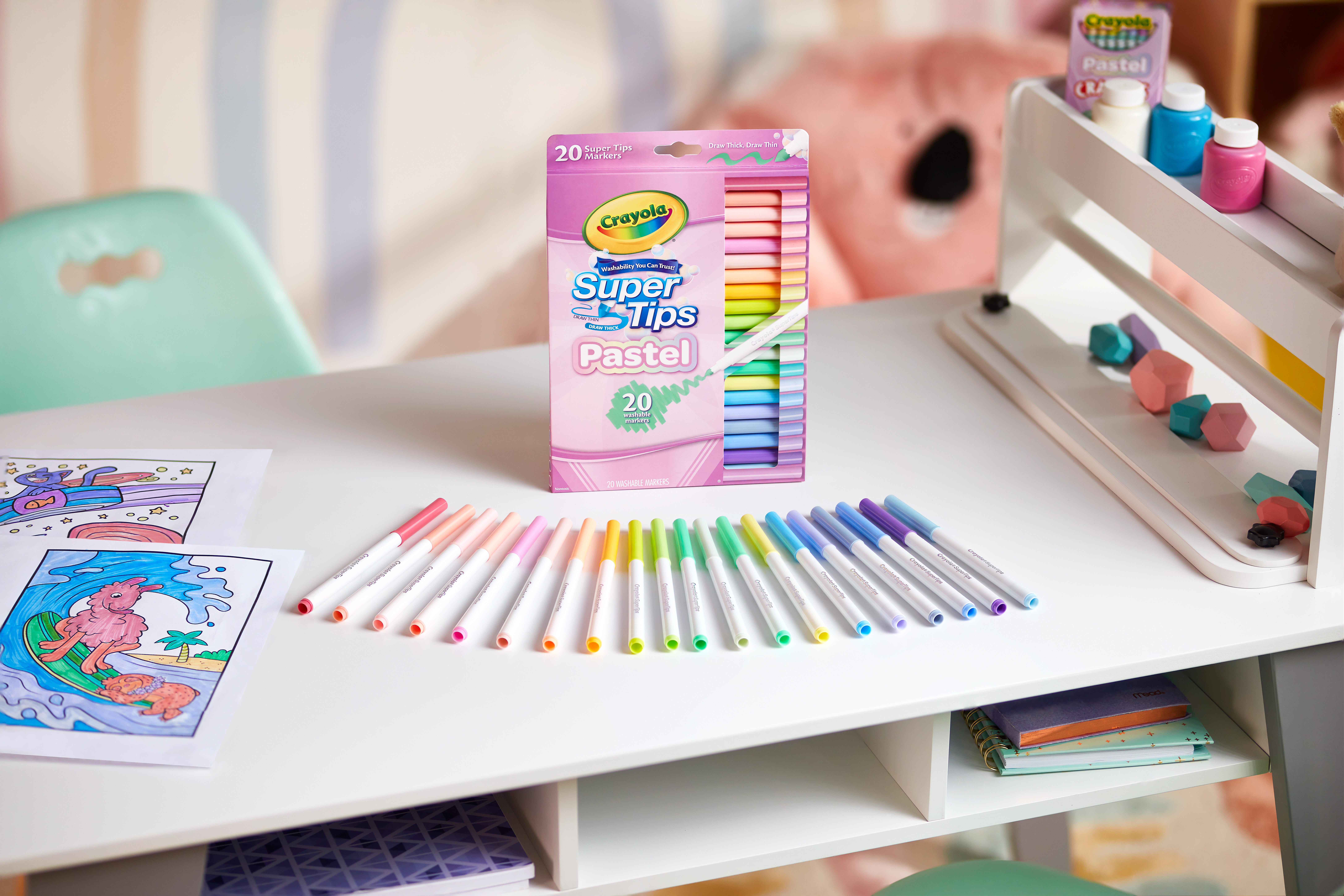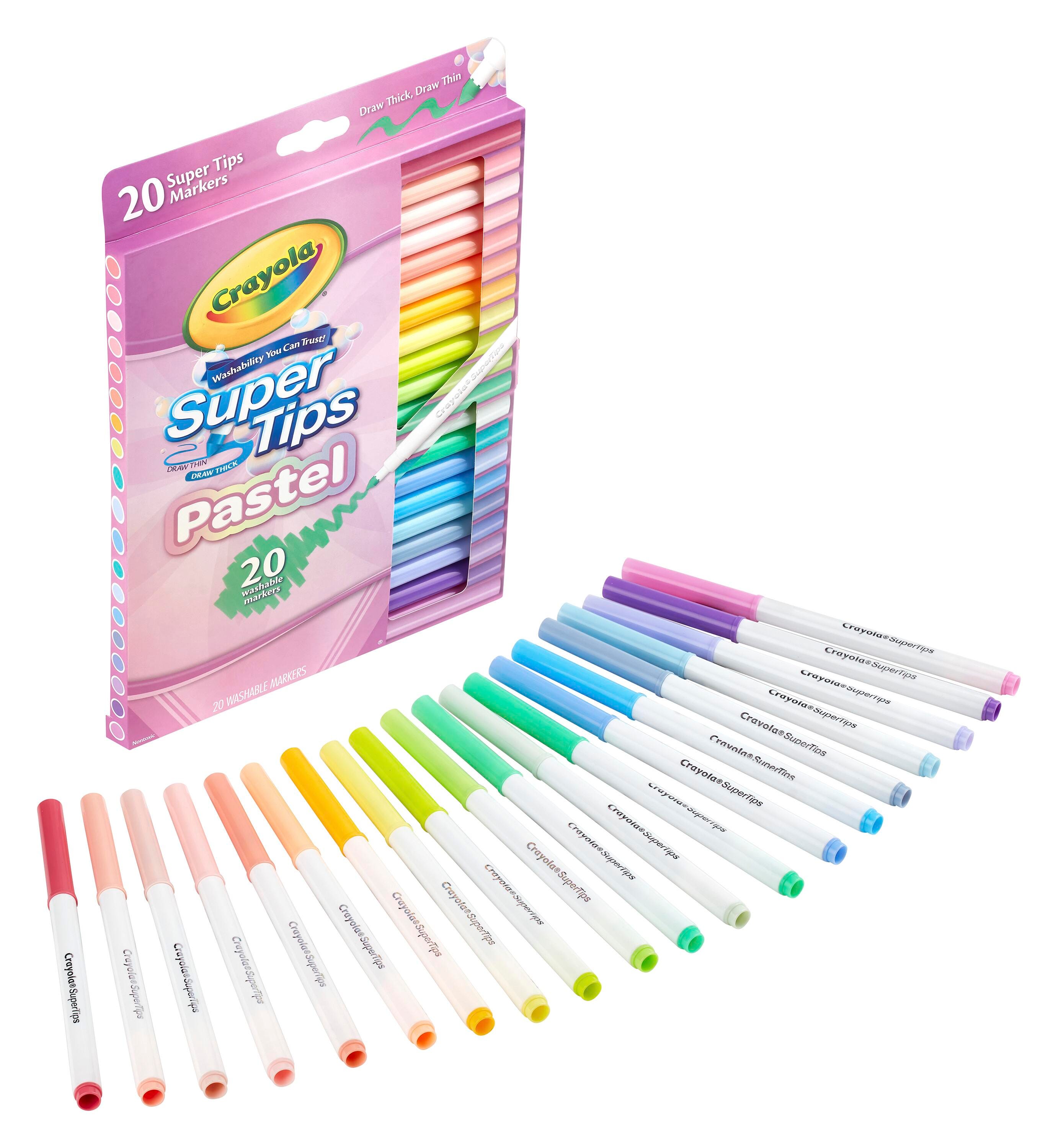The Washable Super Tips Markers from Crayola offer a versatile art tool for coloring, writing, and drawing. The unique Super Tip is designed with a conical shape that draws both thin and thick lines to allow for a variety of creative techniques. The markers deliver vibrant pastel colors that add a whimsical touch to creative activities and feature a washable formula for easy cleanup. This set contains 20 markers in an assortment of 20 individual pastel colors.