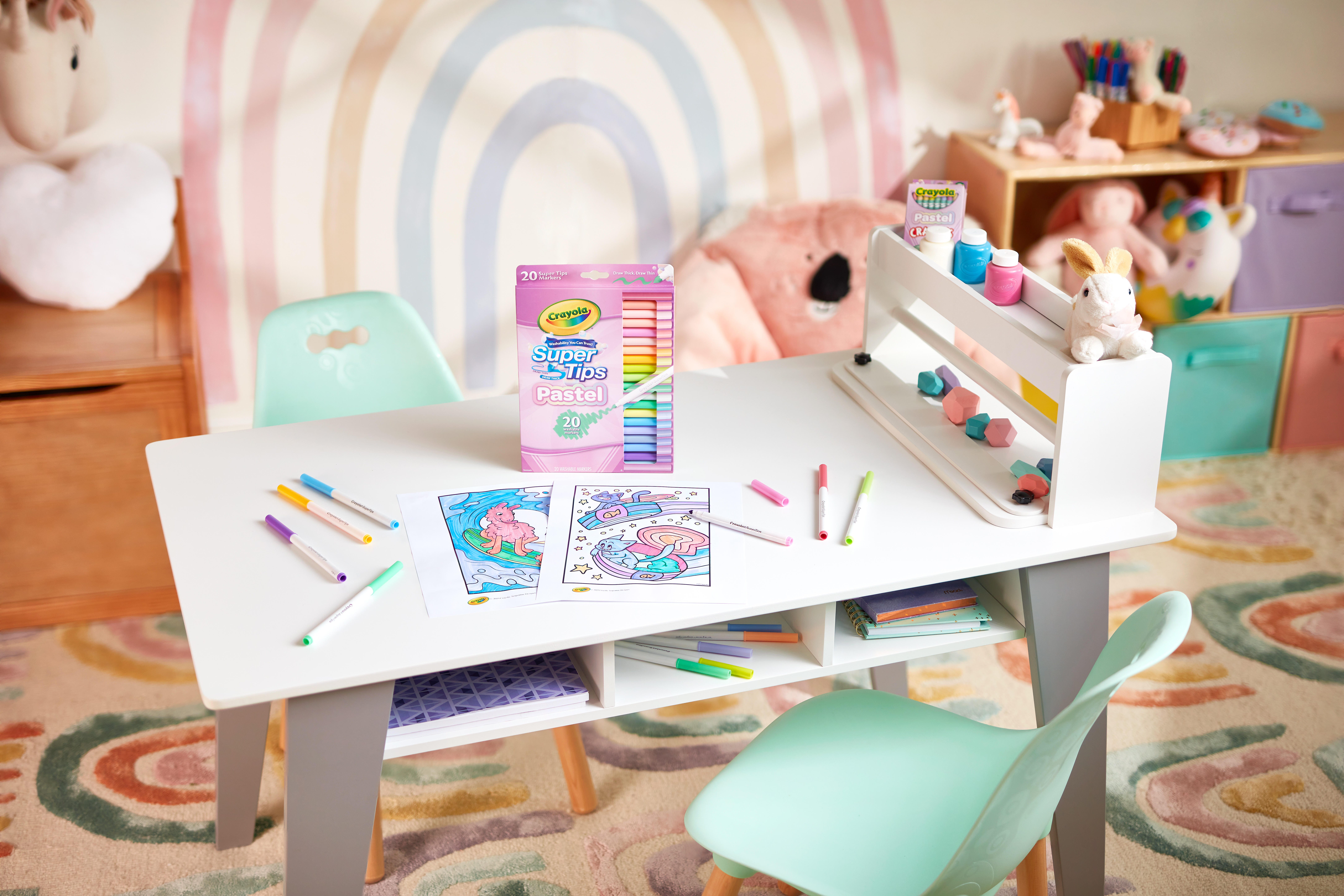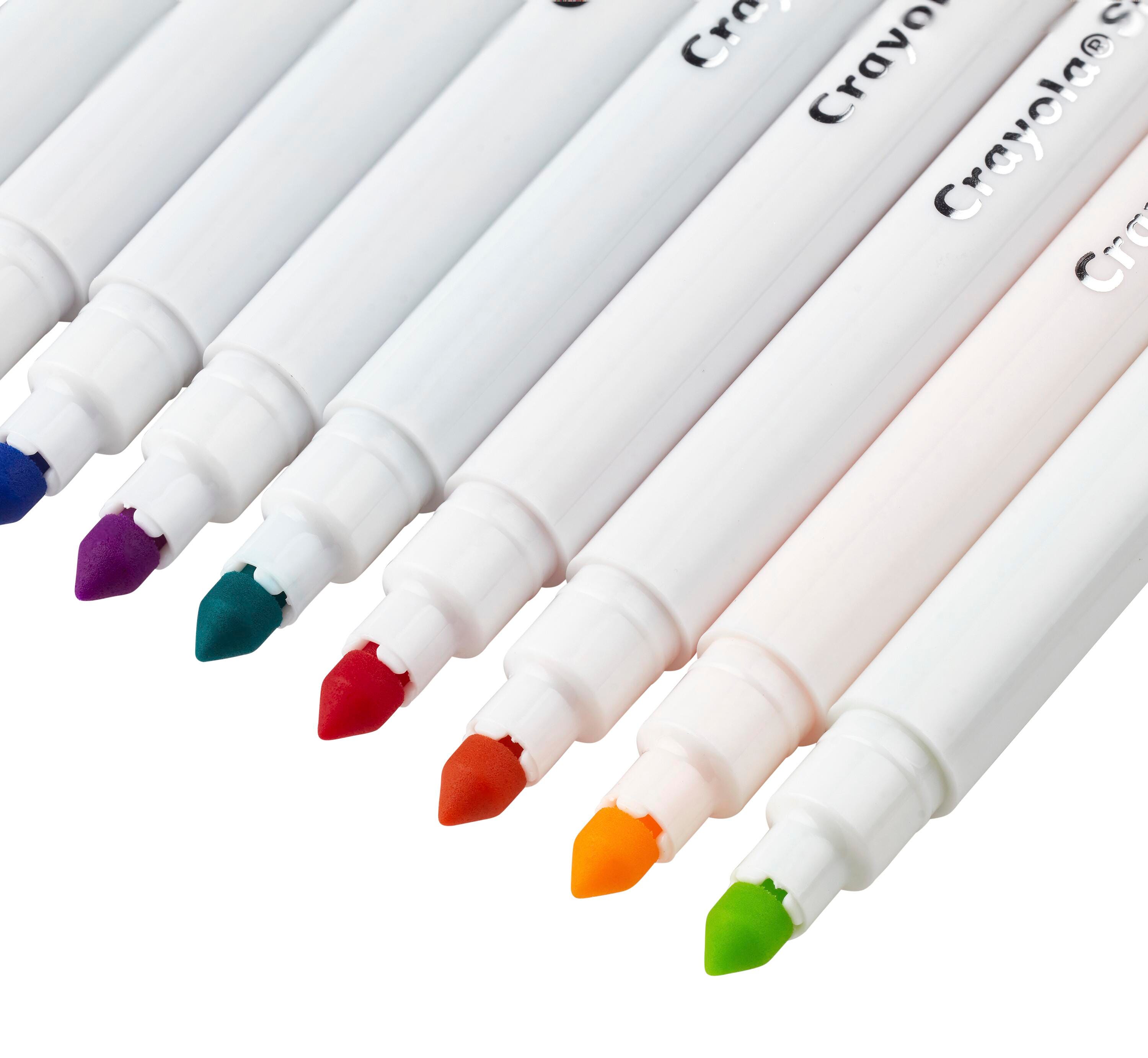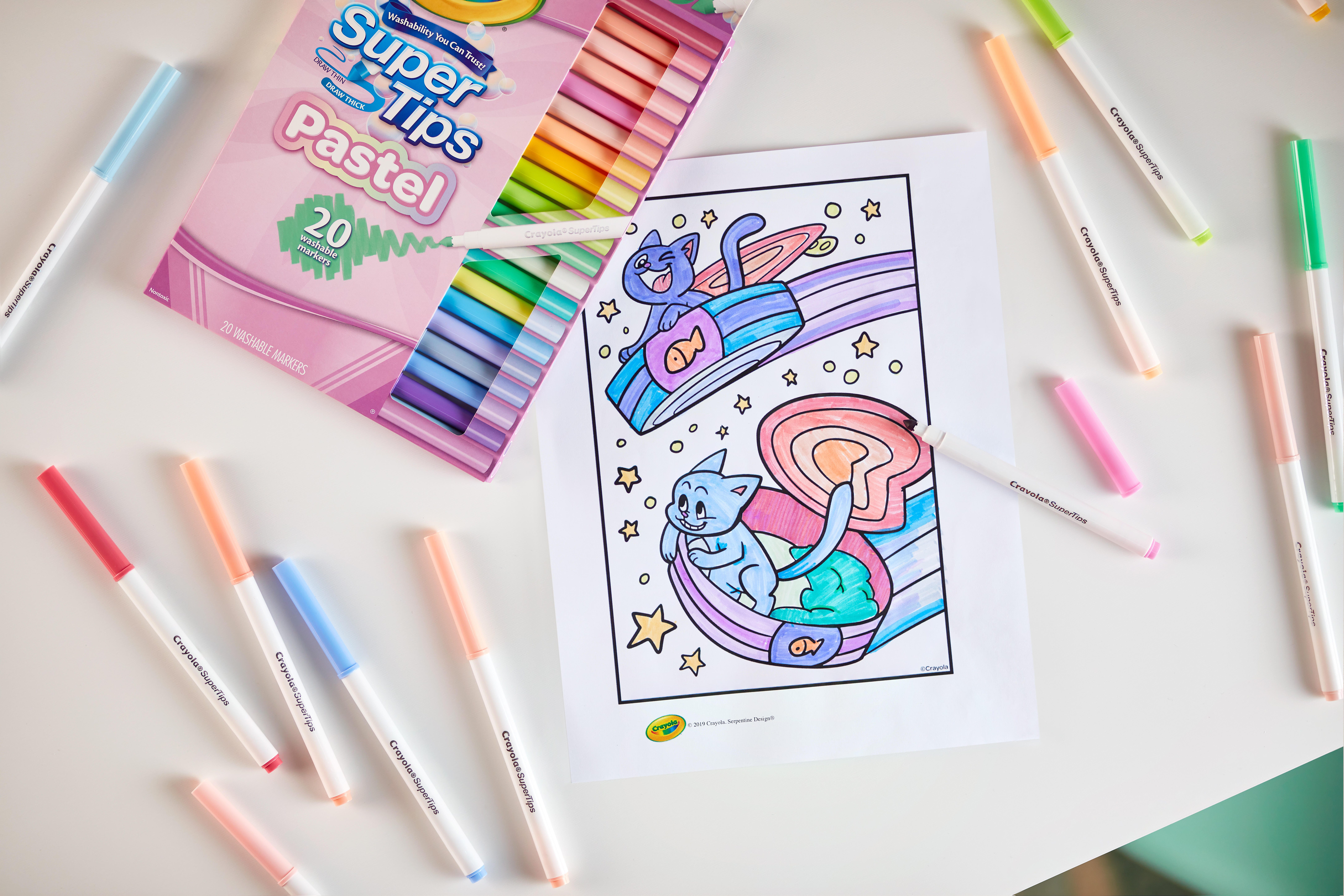 The Washable Super Tips Markers from Crayola offer a versatile art tool for coloring, writing, and drawing. The unique Super Tip is designed with a conical shape that draws both thin and thick lines to allow for a variety of creative techniques. The markers deliver vibrant pastel colors that add a whimsical touch to creative activities and feature a washable formula for easy cleanup. This set contains 20 markers in an assortment of 20 individual pastel colors.