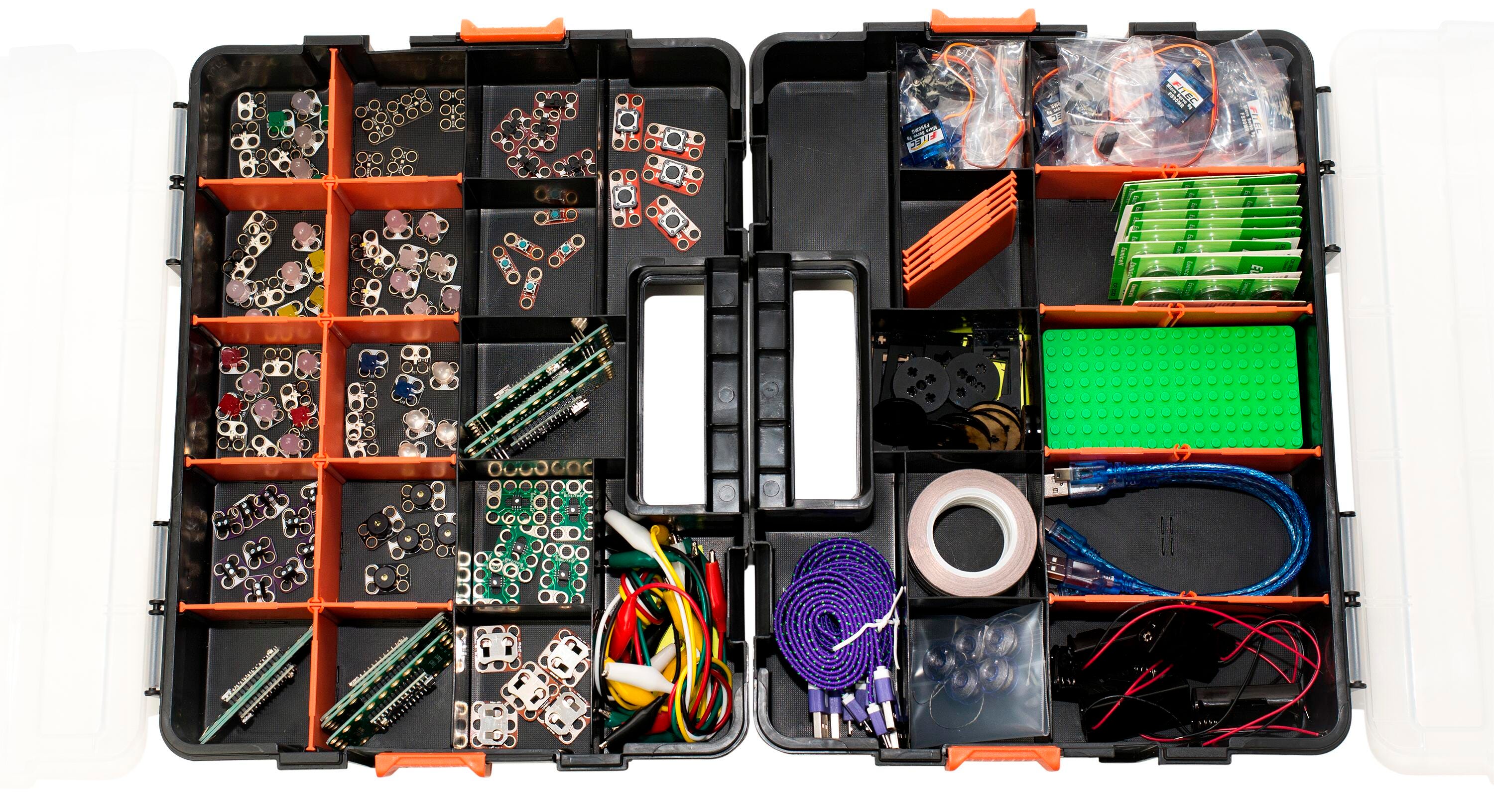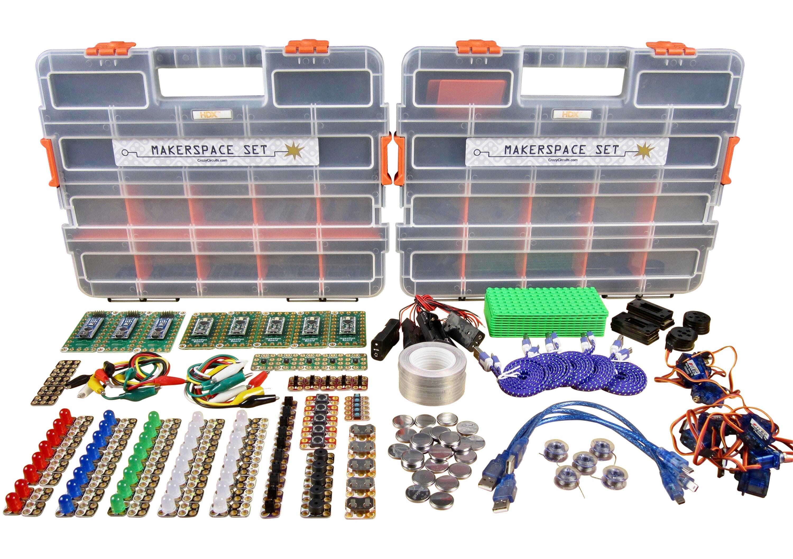 The Makerspace Set has everything you need to get an entire classroom making with Crazy Circuits. Create projects both big and small with over 180 included parts. Create simple analogue circuits on building bricks using the included Jumbo 10mm LEDs, Jumbo Pushbuttons, and Slide Switches. Parts connect together using our amazing Maker Tape, which allows you to create projects in three dimensions! The included Blink/Fade Boards make adding simple lighting effects simple and require no programming. More advanced users can create interactive robotics projects in both the Arduino and Micro:Bit environments. Connect our Crazy Circuits NeoPixel, Piezo Speaker, Potentiometer, and Brick Servos to the included Robotics Boards and Bit Boards for easy programming. Each Kit comes with both brick-compatible Continuous Rotation Servos and 270 Degree Servos, allowing users to create rovers or robotic hands.Features