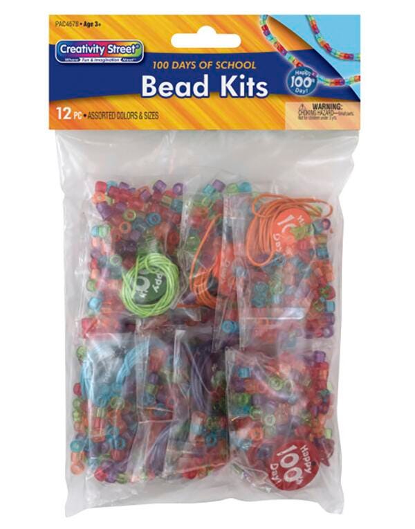 Creativity Street Bead Kit reinforces early math concepts and is a perfect craft project for the 100th day of school. Kit has beads in 5 colors that can be used to teach skip counting, sequencing and pattern making by offering lots of fun. kit comprises 105 beads with printed 100 day bead and 36' string individually packaged in polybag.Features