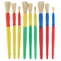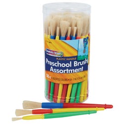 The Creativity Street® Preschool Brush Assortment set contains durable plastic-handled brushes with natural hog bristles and plastic ferrules. These brushes are specially designed to be easier for children to hold and control. This set includes 58 round, brightly-colored brushes for children of all ages! These are available in convenient classroom packs in a reusable plastic container.Features
