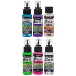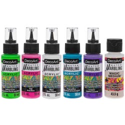 DecArt Water Marbling Acrylics 6ct Tropical Set is an easy to use starter kit that includes (5) water marbling acrylics and Magic Medium. After mixing DecoArt's Magic Medium with water, you can use Water Marbling Acrylics to create delicate and unique designs directly on the water's surface.Includes: