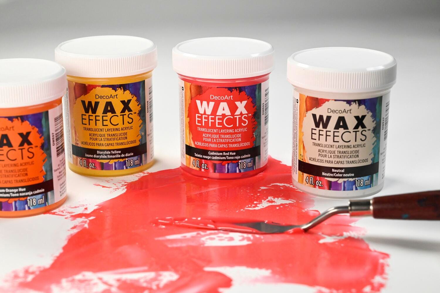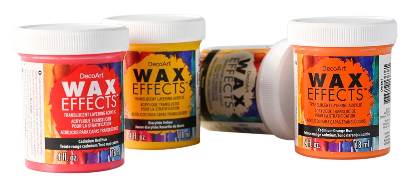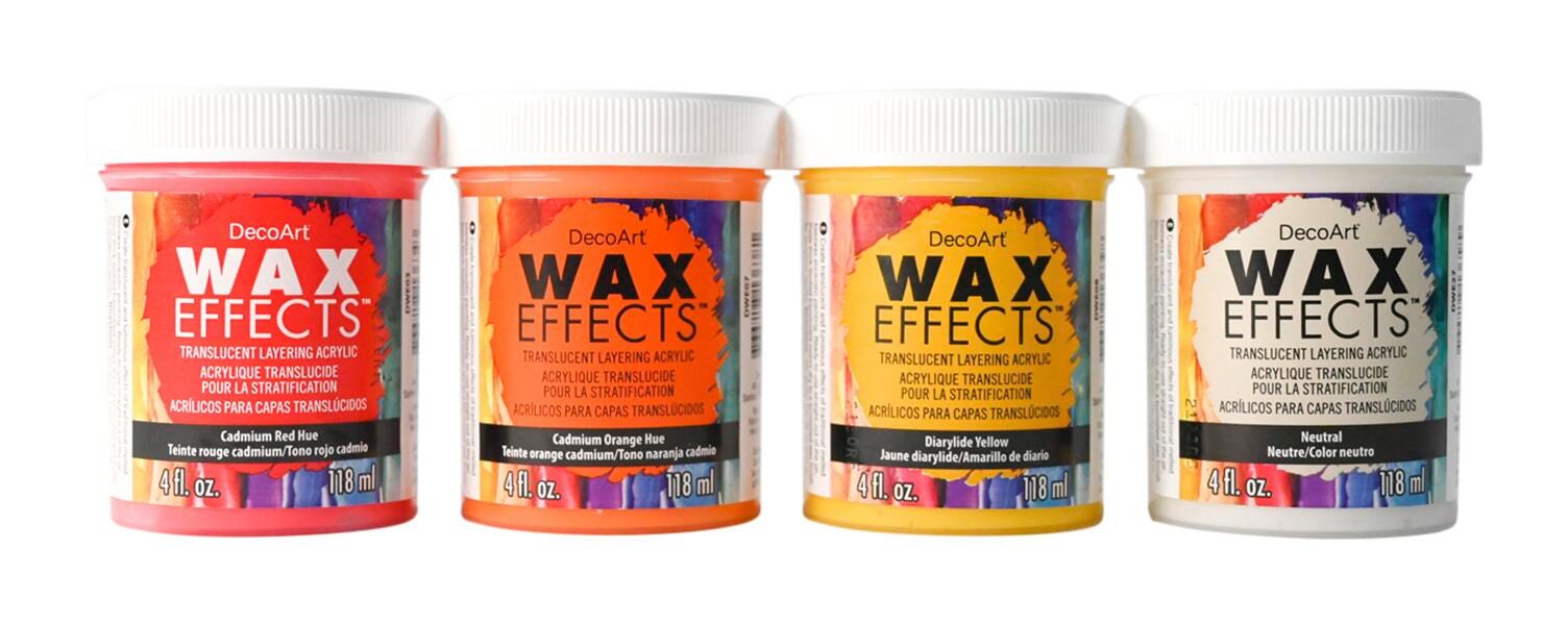 DecoArt Wax Effects Acrylic Paint is a ready-to-use acrylic, designed to recreate the sheer, luminious, qualities of traditional beeswax encaustic. No heat required. Ready to use straight from the jar.Includes 4 oz. Jars of DecoArt Wax Effects: