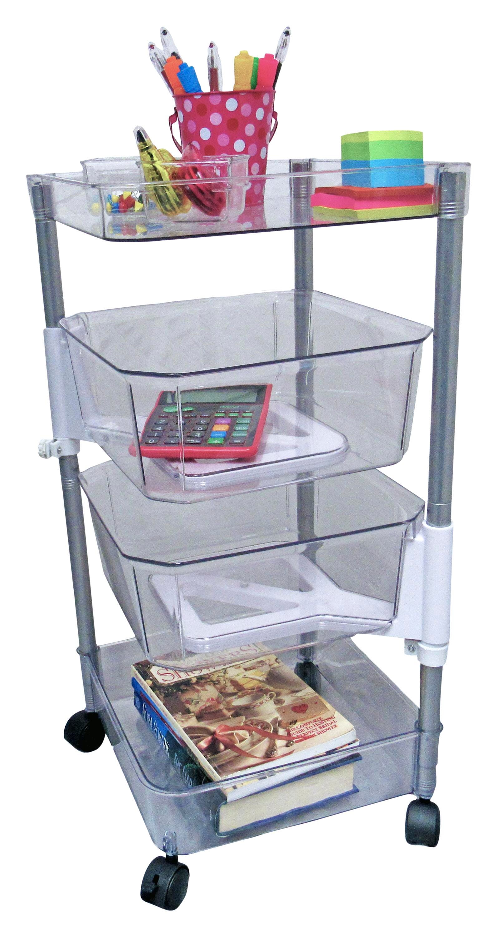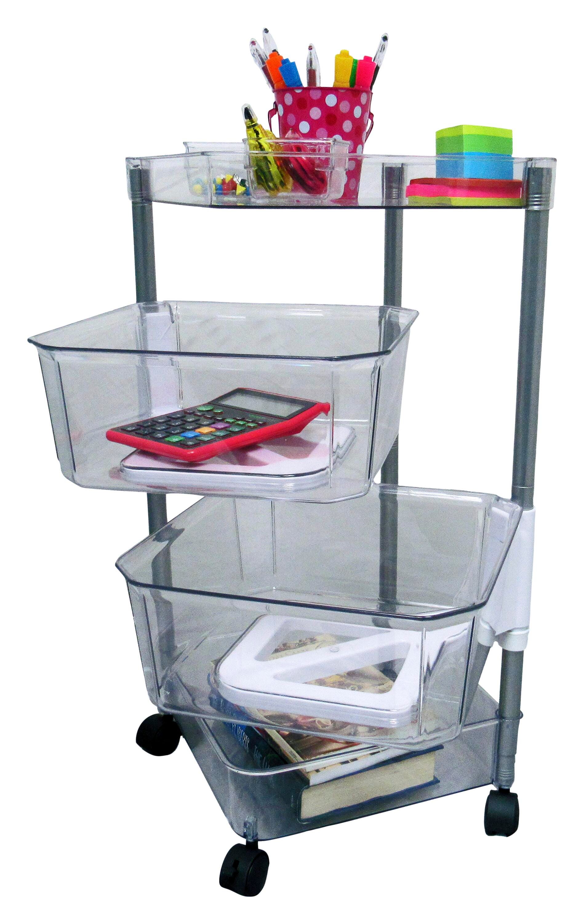 4-Tier Clear Cart with Movable Bins - Easy to assemble. No tools required. Cart has steel posts and deluxe casters with brakes. Two middle bins swivel for easy access. Clear PET material allows you to see the contents. Handy in any room, be it classroom, bathroom, closet, or kitchen.Features