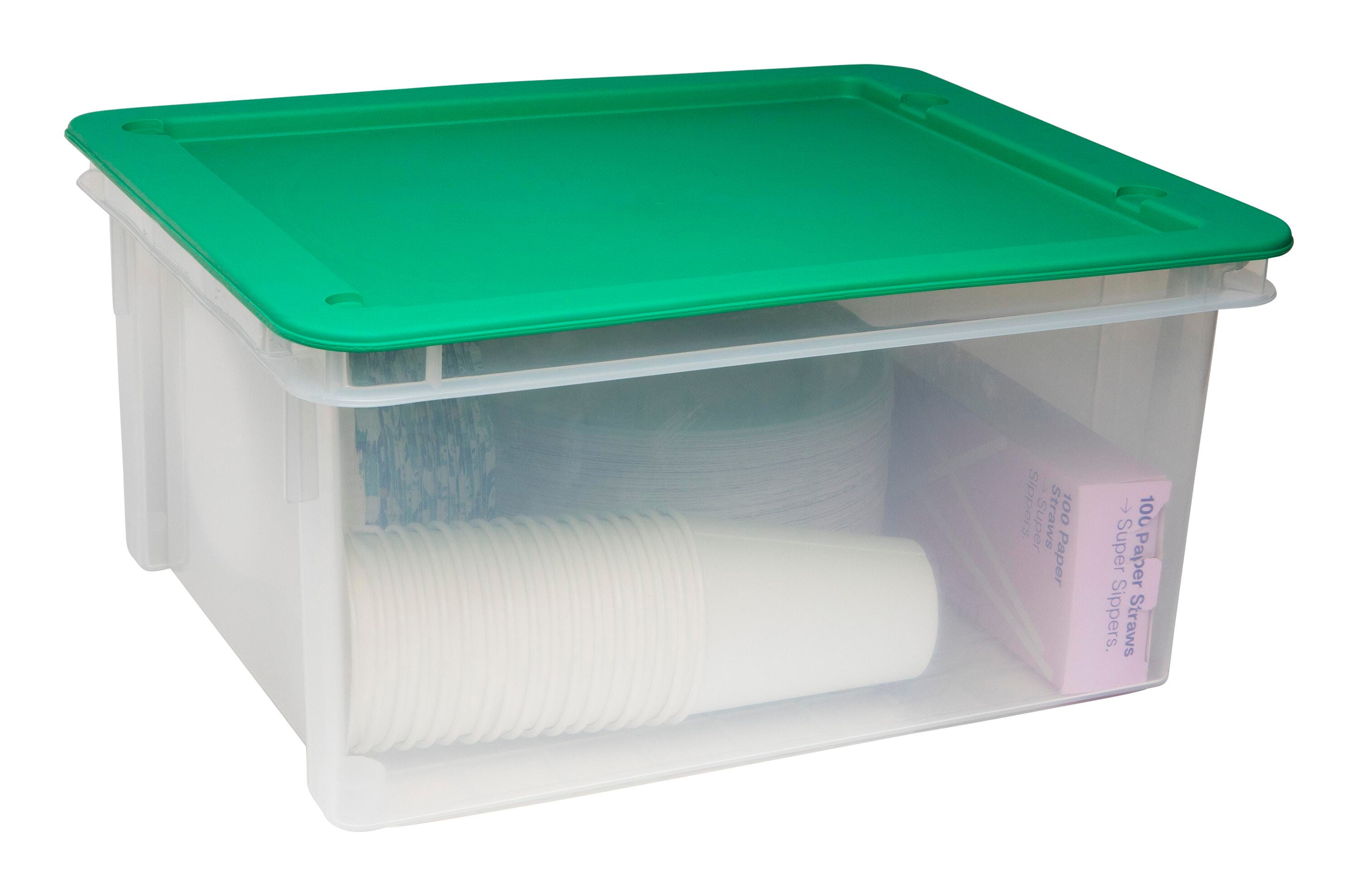 Keep your space tidy and your items organized in this sturdy large plastic tote with lid.