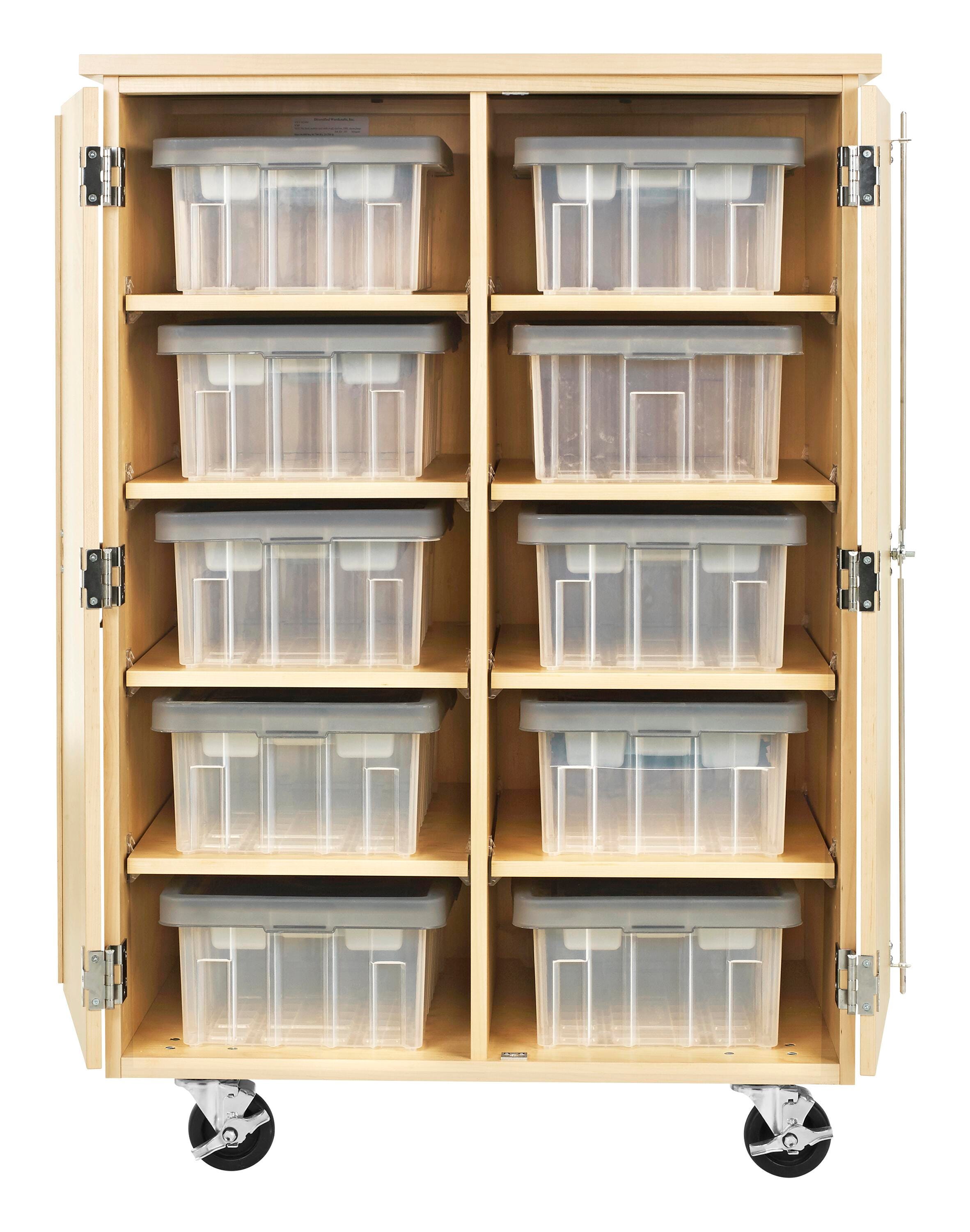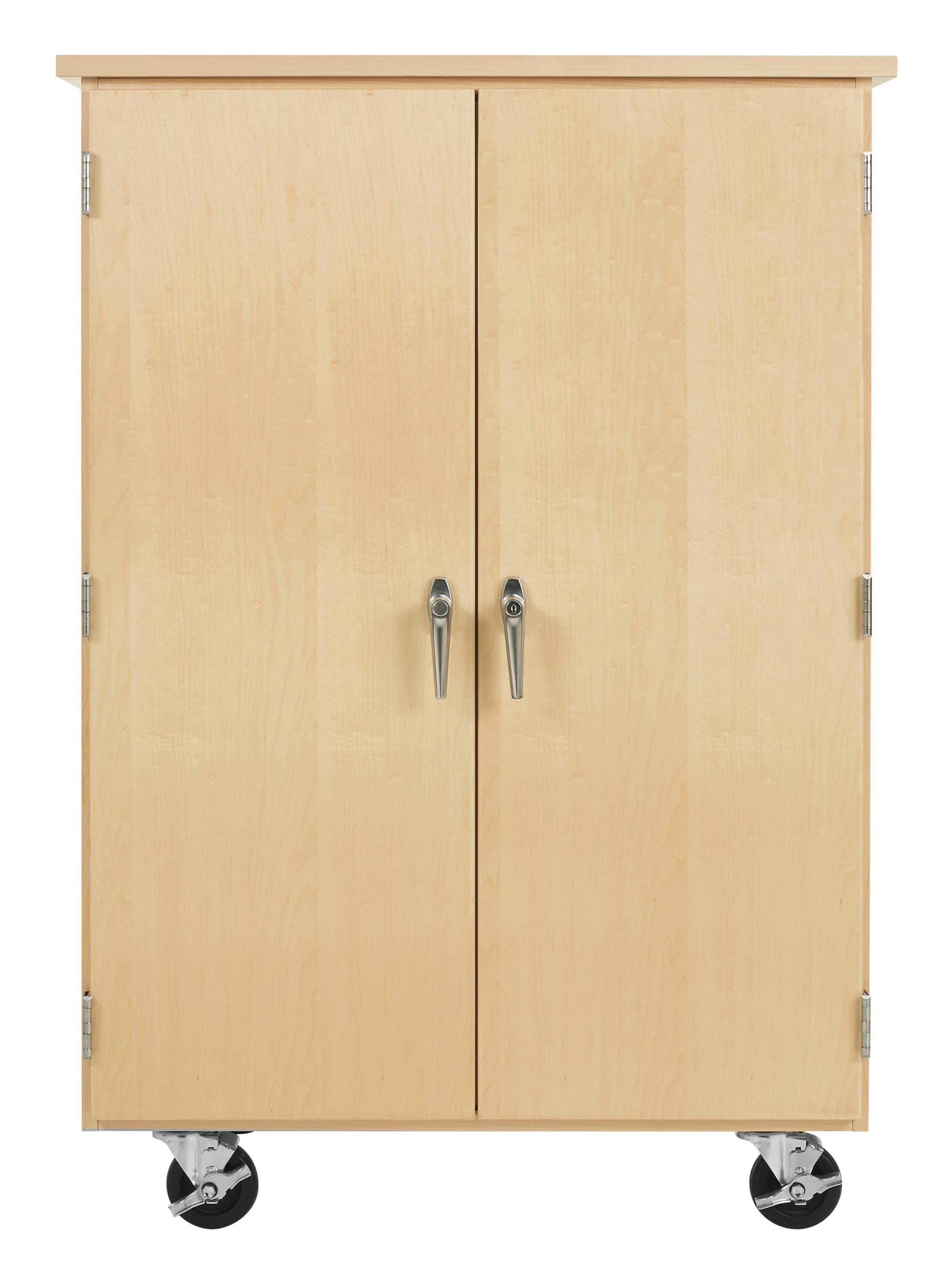 A mobile storage cabinet designed to work perfectly to store your robotics tote trays. The cabinet is made of maple plywood and has swinging doors that are outfitted 3 point locking handles for security. The interior has adjustable shelves for versatile storage. The cabinet rolls easily on heavy duty locking casters. Cabinets are available with and without the Vex Robotics Logo.**Totes are provided from Vex with the purchase of robotics kits. Totes, Robots, and Robotic Kits are not included.