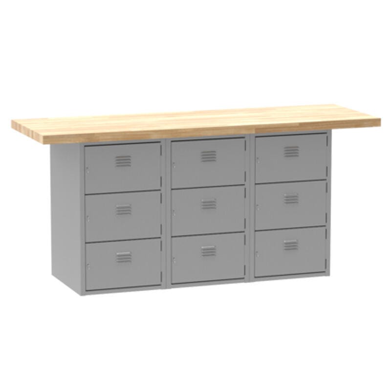 This series offers 1-3/4" maple tops and 4 bench lengths and 3 locker styles to choose from. The all-welded, 1-section construction has reinforced side panels (20-gauge). Locker doors (18-gauge) have air vents, spring hinges, padlock hasp & knockout plug for cylinder lock. Choose between vertical lockers, horizontal lockers or double door bases. Your choice of black or gray baked enamel finish. Counter tops need to be attached during assembly. 32-3/4"H.Cabinets and tops