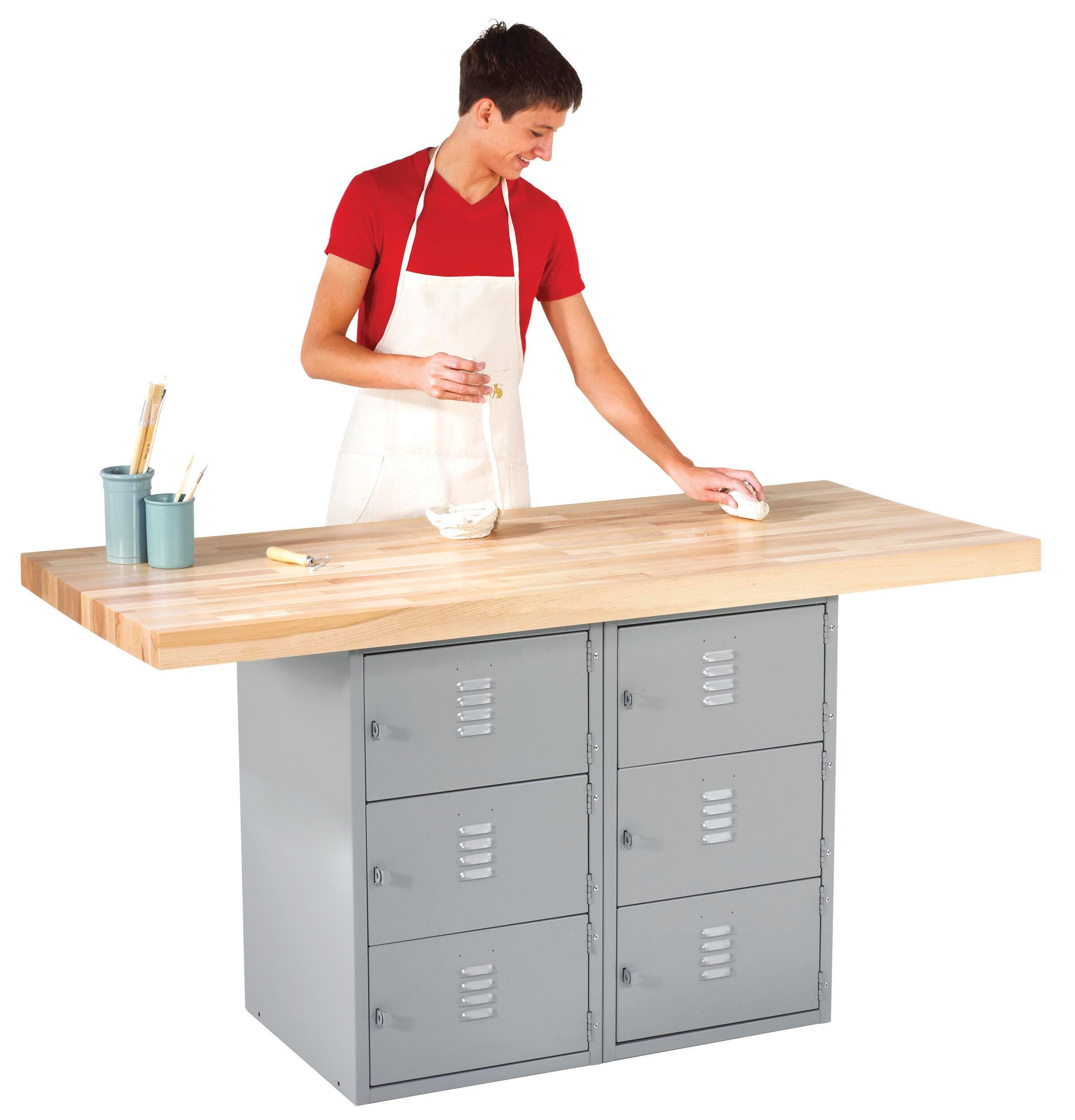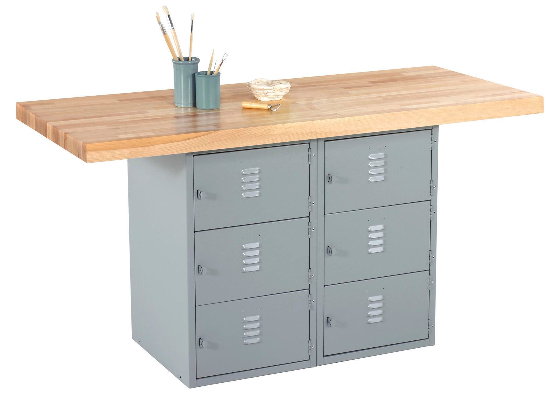 Six locker work bench has a sturdy all steel constructed base with reinforced side panels and a 2-1/4 inch thick maple top.