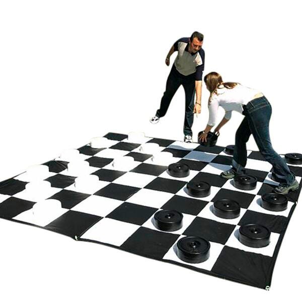 Checkmate! This giant checkers and mat kit provides a fun and interactive way for beginners to learn the game of checkers in any outdoor or indoor gym setting.. A central movement rod provides ease of handling. The 10 x 10 foot mat is made of heavy-duty vinyl with grommets and includes pegs for the grass. Round checker pieces each have a 10 inch diameter.Set Includes:
