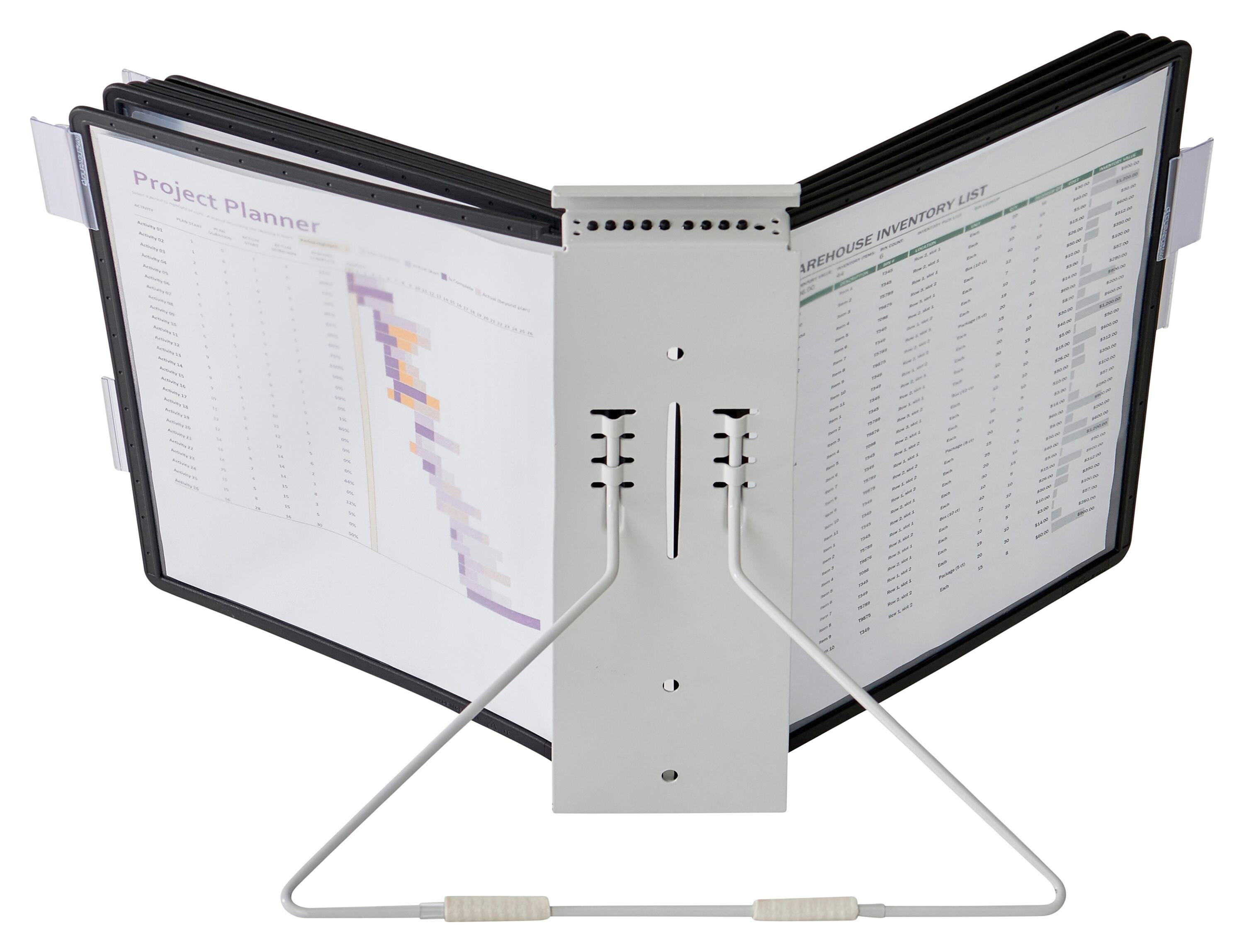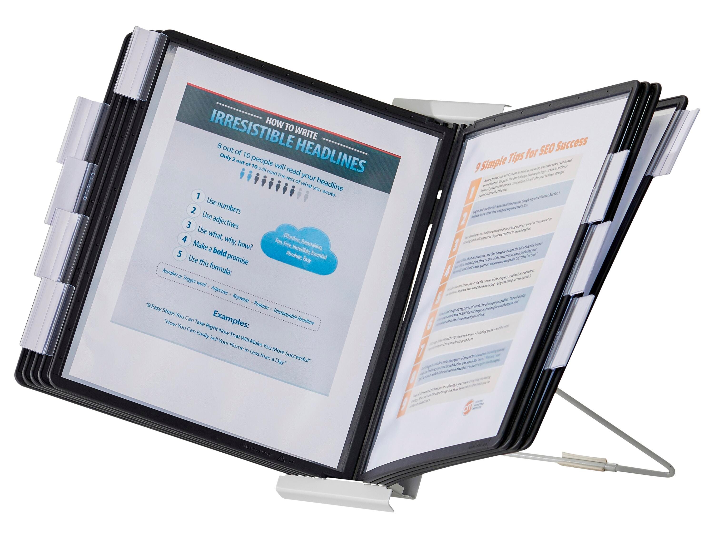 Durable Instaview Desktop Reference System is rendered with 10 letter size, non-glare, double sided polypropylene black panel that offers 20 viewing sides with rigid borders and 5 snap-on tabs.