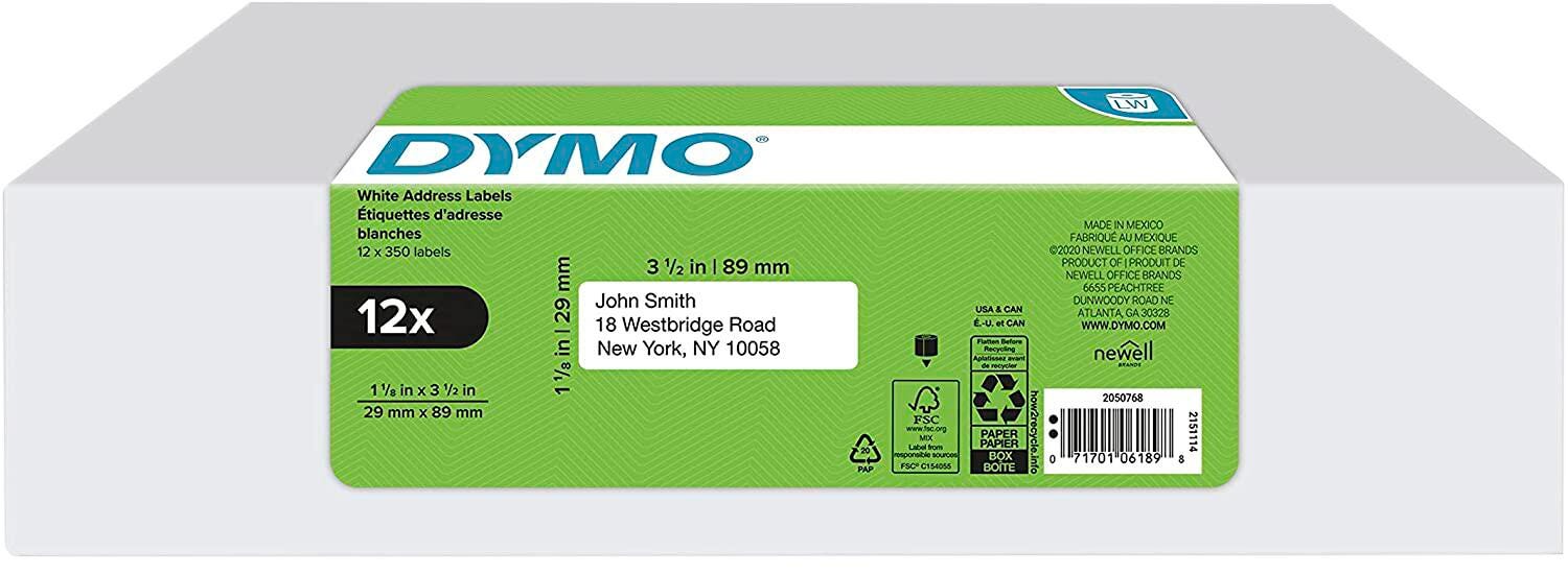 DYMO LabelWriter Address Labels, 1-1/8 x 3-1/2 Inches, White, 350 Labels/Roll, Box of 12