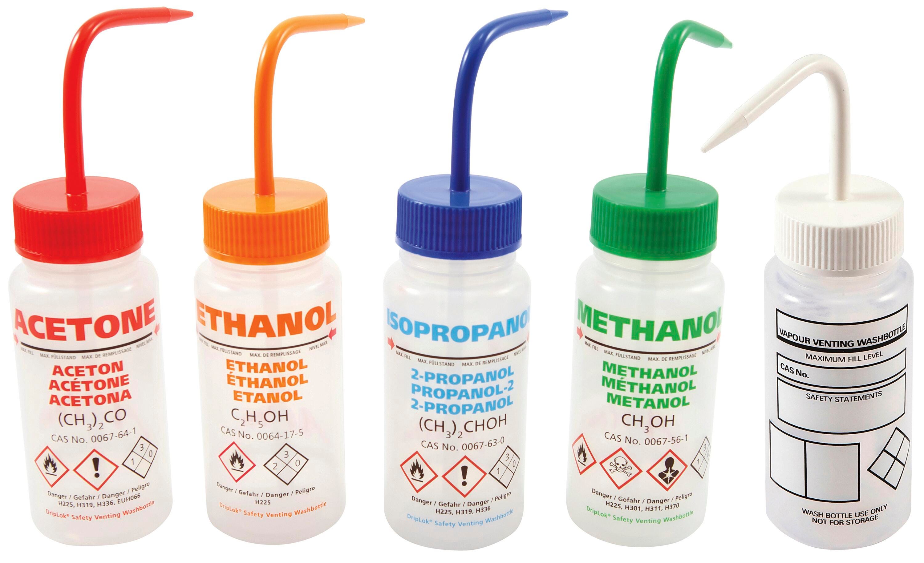 Dynalon Multi-lingual Wide Mouth Wash 250 ml Bottle is made from polypropylene and the jet-tip aperture closures offer fine control. Bottle features a DripLok vapor venting valve that prevents solvent drips and is printed in 4 languages. It is sold as 5 per set.