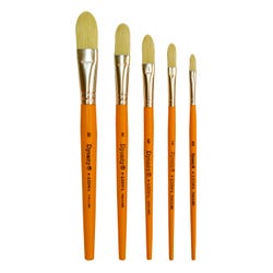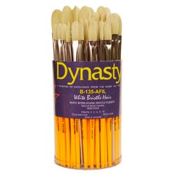 Dynasty Brush B-135-AFIL white interlocked synthetic white bristle brushes come in a convenient canister, great for storage and easy accessibility for any classroom or art studio. These brushes have short yellow lacquered white birch handles featuring seamless metal ferrules. The filbert brush type is shaped to an oval, that is the most versatile and ideal for blending and creating soft edges around natural objects.Set of 60 White Bristle Brushes Includes: