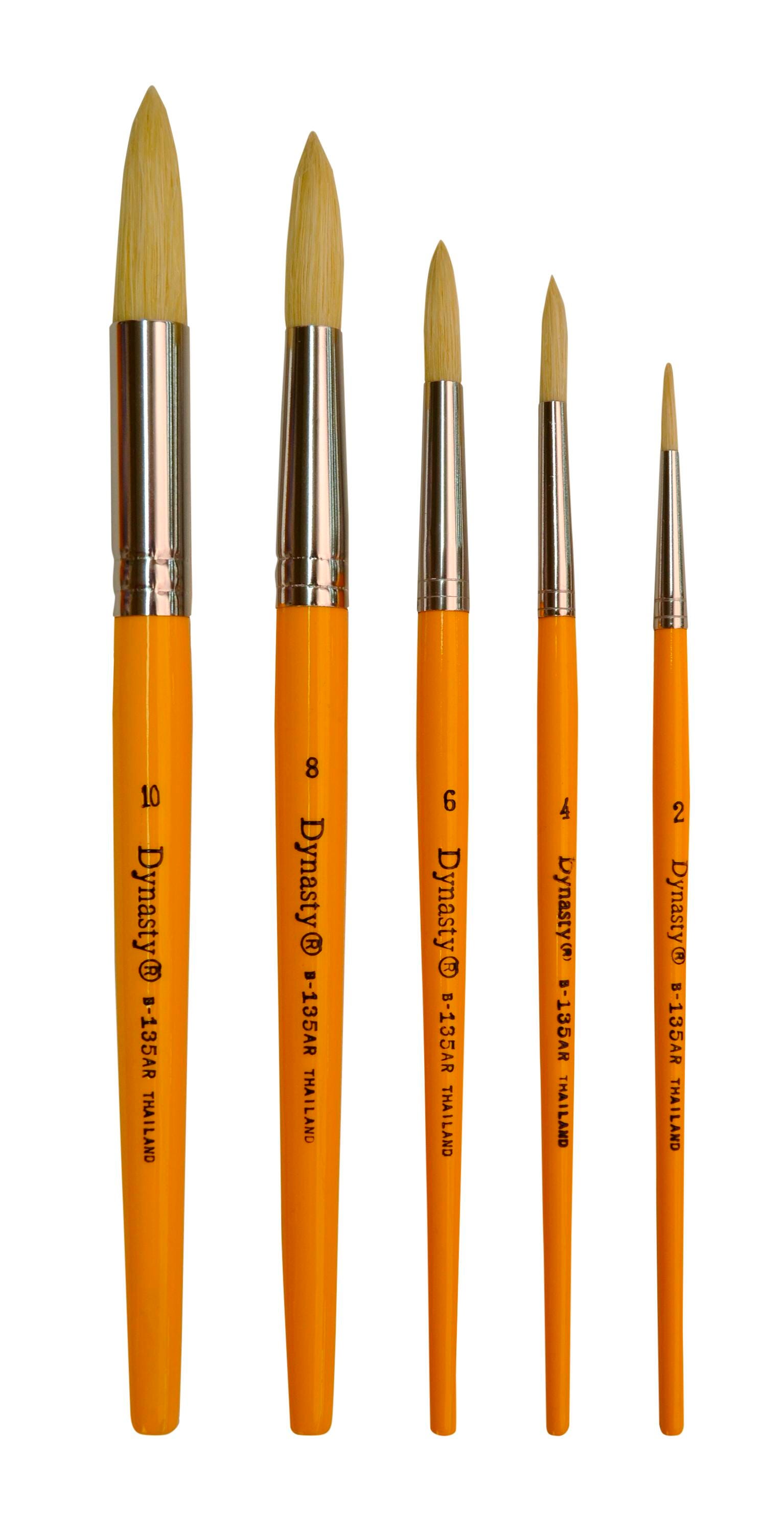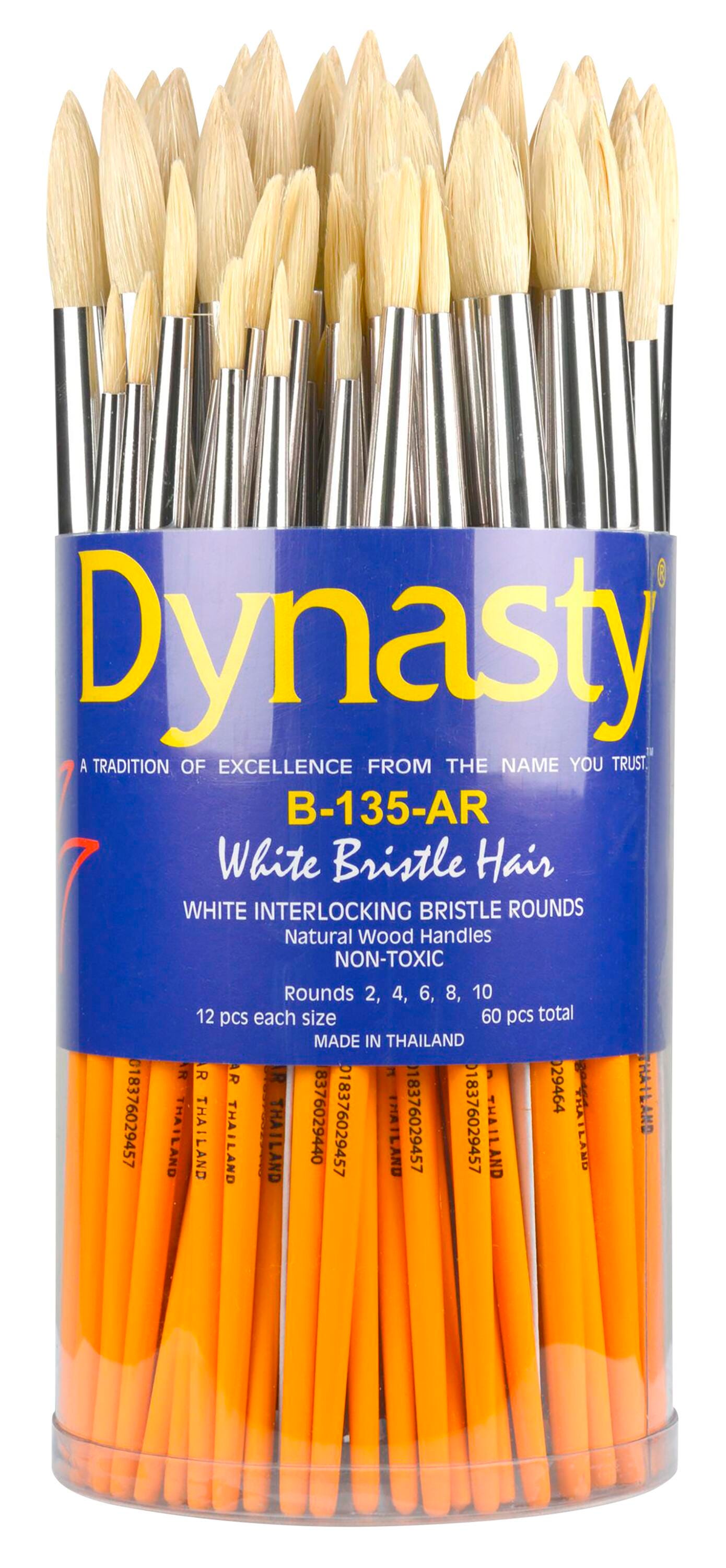 Dynasty Brush B-135-AR white interlocked synthetic white bristle brushes come in a convenient canister, great for storage and easy accessibility for any classroom or art studio. These brushes have short yellow lacquered white birch handles featuring seamless metal ferrules. Round brushes come to a fine point with strokes that are more organic and affords a softer application.Set of 60 White Bristle Brushes Includes: