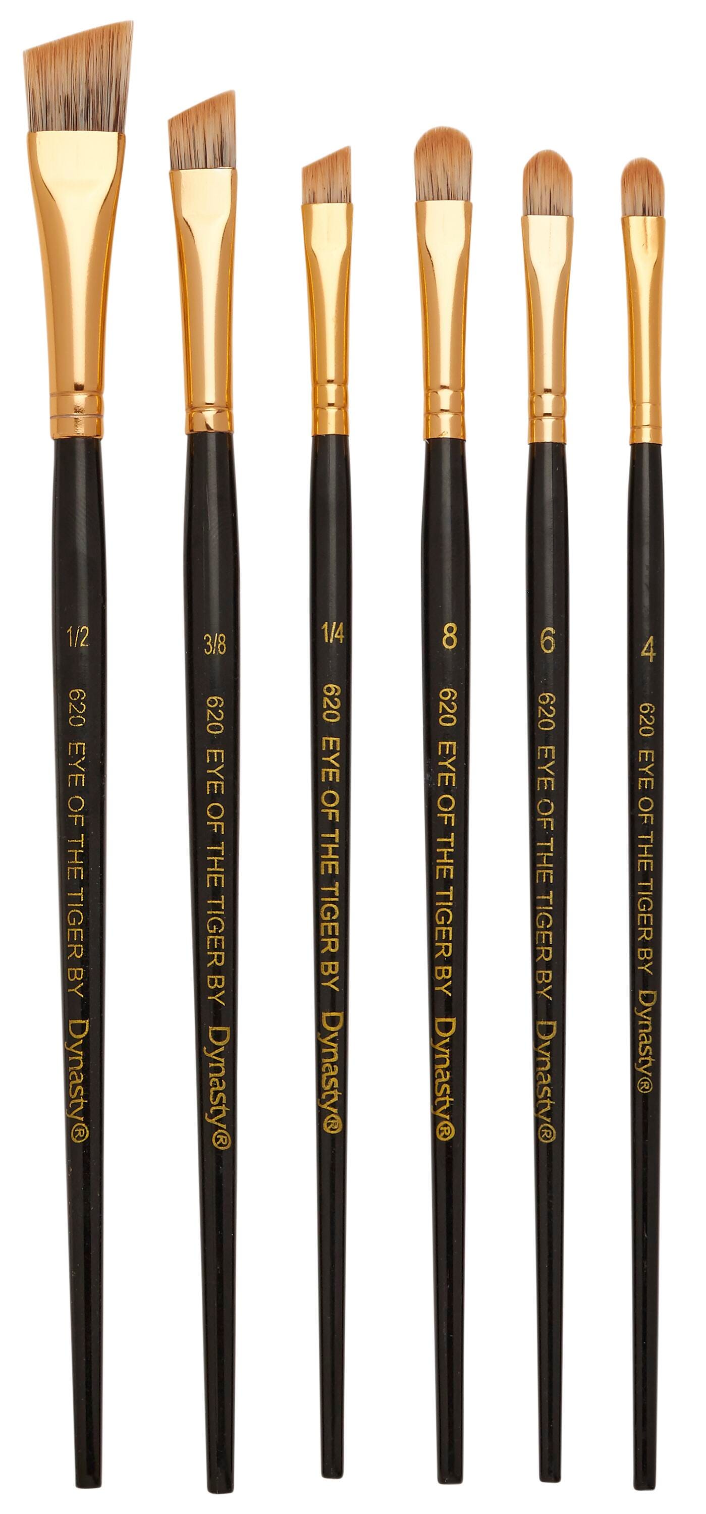 Dynasty Eye of the Tiger brushes comes in a convenient classroom canister containing hand-crafted soft synthetic hair brushes with very good snap and shape. Black plastic handles and golden seamless metal ferrule offer safe, long - lasting beauty and performance. This economical brush is excellent for ceramics, but its flexibility allows it to be used on multiple materials such as paper, wood, and stone. This assortment includes the angled brush type which is best used for making clean and crisp, straight, and precise lines. Also included in the assortment is the oval brush type which is the perfect tool for general painting and profile work .Features