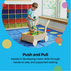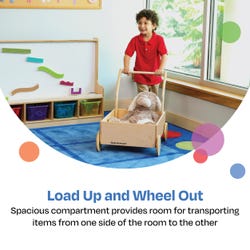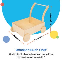Load up and wheel out with our Push Cart for children on the move. This uniquely designed, wooden Push Cart is perfect for your active learner looking to explore through the playroom, care space, or classroom. Can be used for dramatic play or to transport weighted objects, and can assist with common standing, pushing, and pulling actions as children develop their gross motor skills through play. Cart measures 18 W x 26-7/16 D x 22 H inches. Comes fully assembled.Features