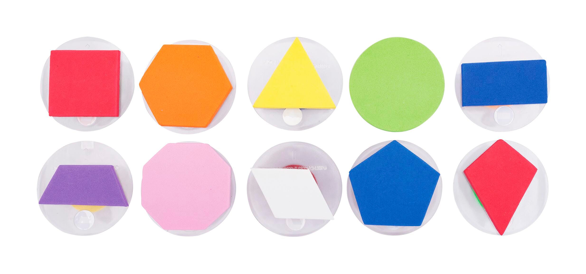 Center Enterprises Giant Geometric Shape Stamp Set of 10 comes in a large 3 inch size with comfort grip handles making it easy for younger children to stamp fun paint and ink designs. Each set comes in a sturdy, reusable storage case for big painting and stamping fun.Features