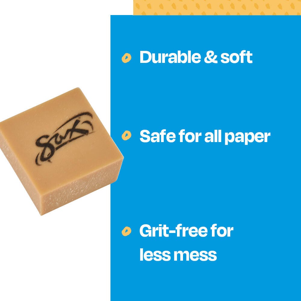Sax art gum erasers help clean up projects without harming delicate work or paper surfaces. The soft, gummy texture is non-hardening, grit-free, and non-abrasive. It removes surface dirt without smearing to protect sheets while cleaning. These eraser blocks crumble more easily to collect graphite and produce less damage than traditional erasers. Turn to the soft, gummy texture to help protect your best projects.
