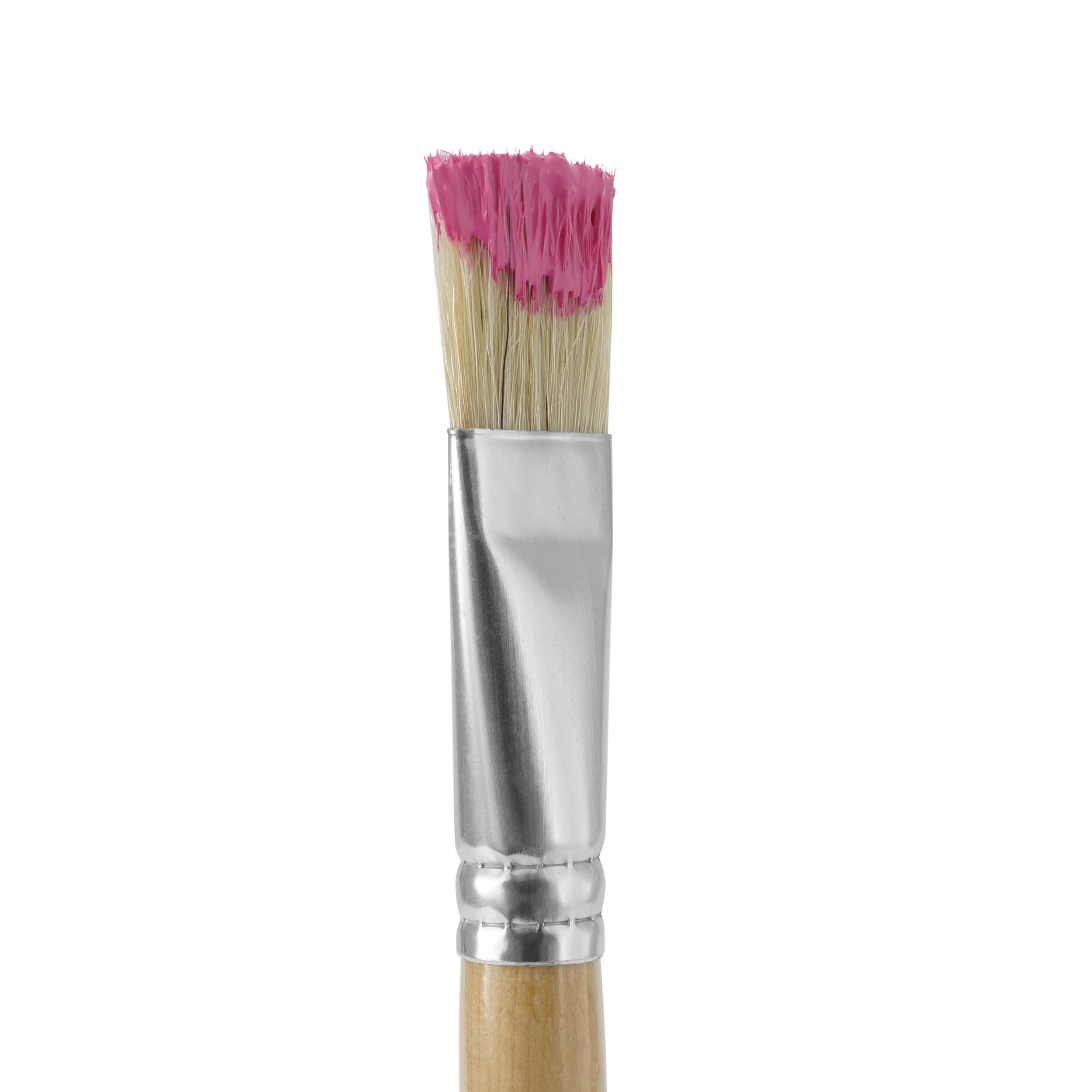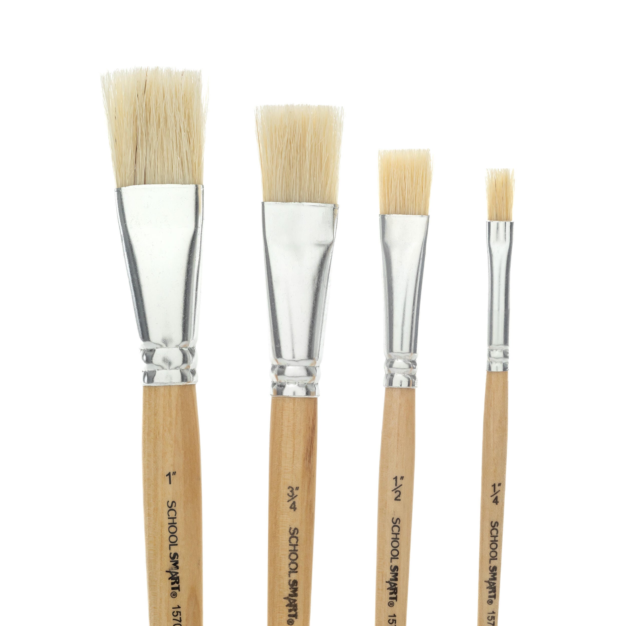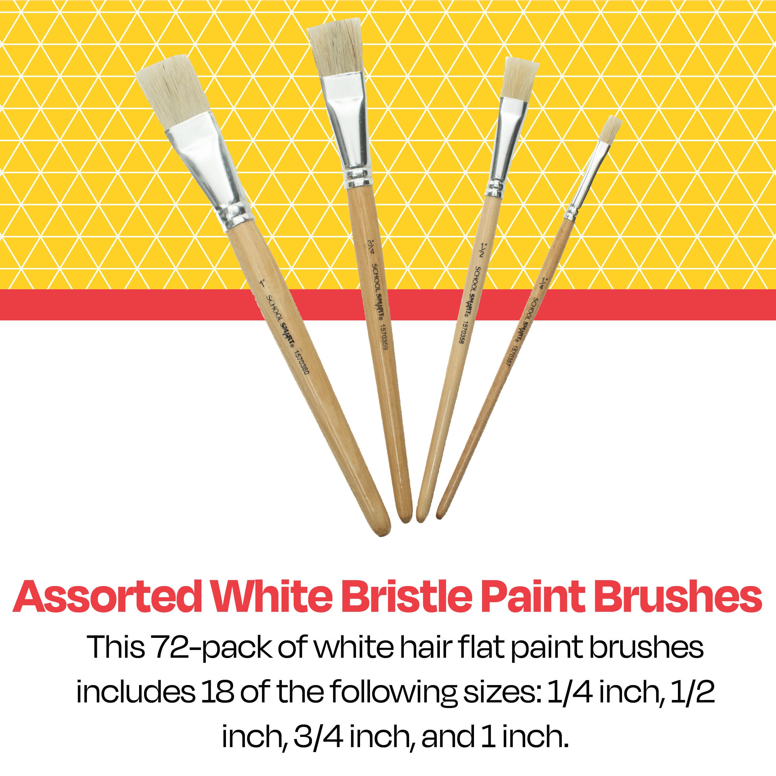 Stock your art room with School Smart white bristle paint brushes for kids and adults. Made of high-quality materials, the short handle paint brush set features brushes with bristles that are interlocked in smooth aluminum ferrules on clear-coated hardwood handles. The bulk set comes with 72 art brushes total, with 18 each of 1/4 inch, 1/2 inch, 3/4 inch, and 1 inch brush sizes. Includes a convenient storage bucket.