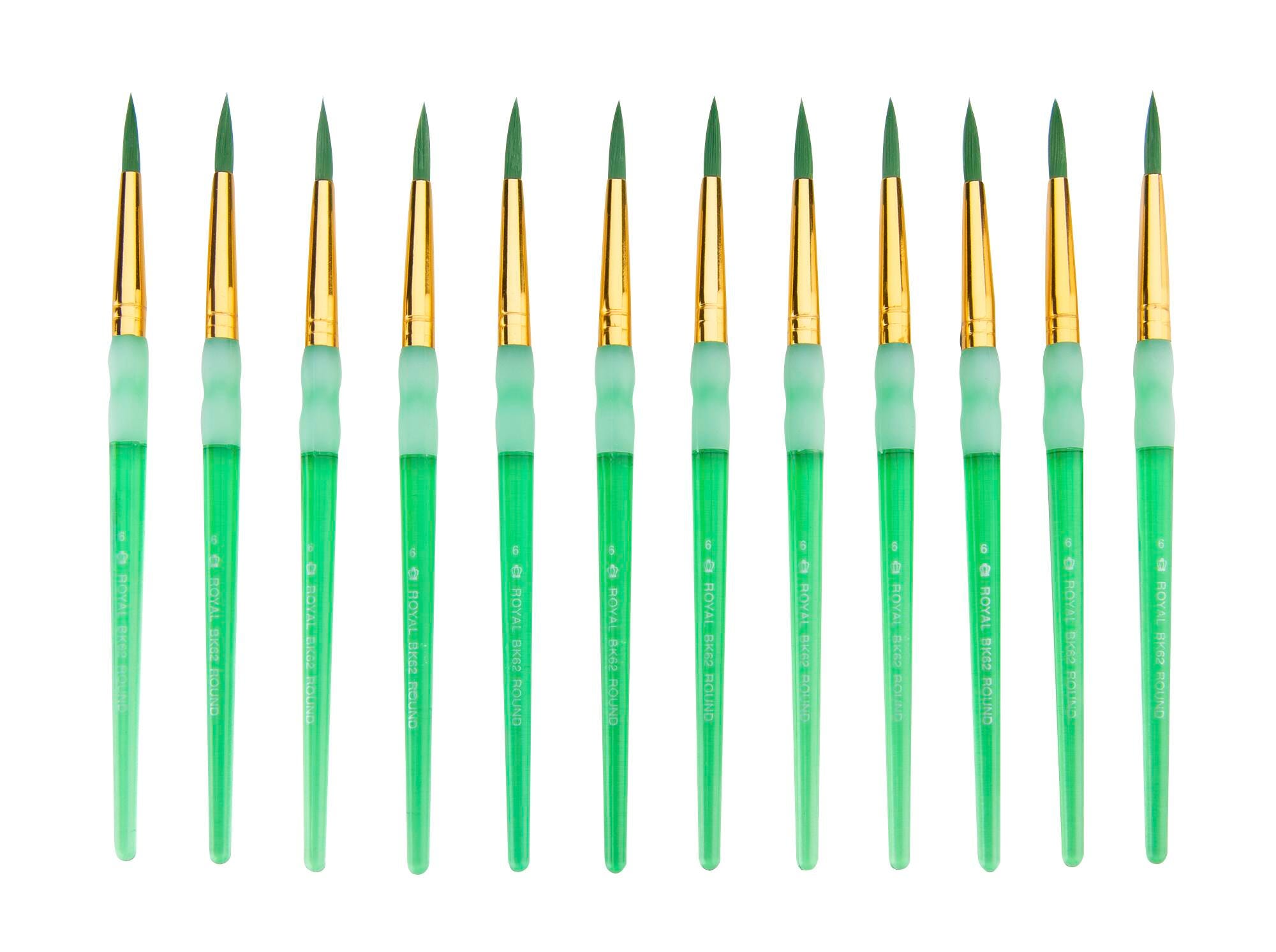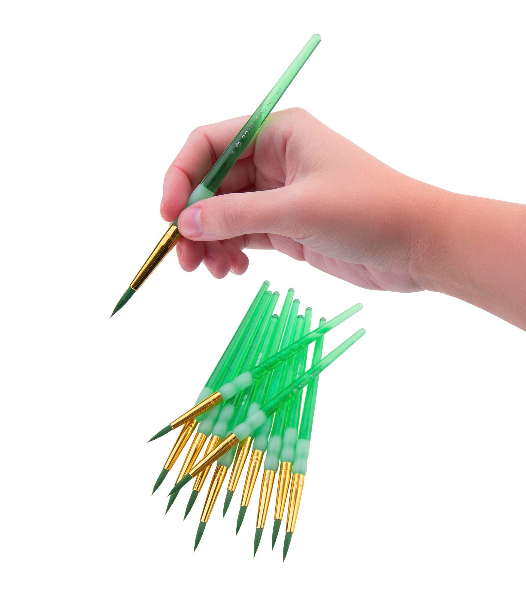 This Big Kid's Choice™ paint brush set from Royal & Langnickel delivers 12 round brushes designed for young artists. Each brush features a shorter and thicker handle and a Soft-Grip™ rubber grip, all to provide more control for smaller hands. The synthetic hair is an excellent choice for acrylic and watercolor painting. The brushes are color-coded to represent the different types, with this pack offering 12 green, size 6 brushes.Features