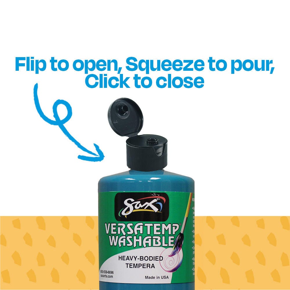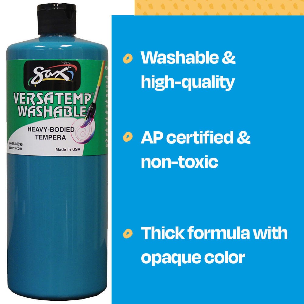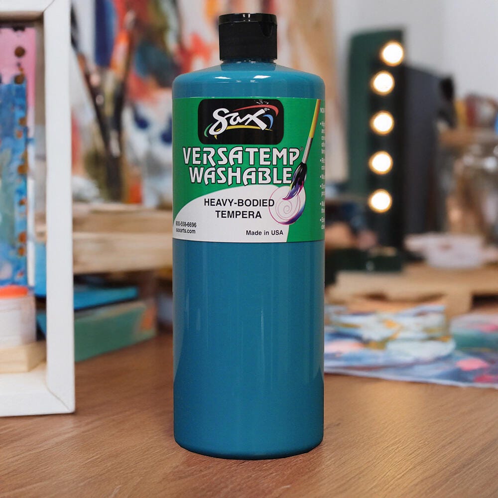 Sax Versatemp washable heavy-bodied tempera paint in a turquoise color crafts bold, vibrant color with a mess-free formula. Foster creativity with a paint that enables more fun and easier cleaning for children and adults. While most kid-friendly formulas lack pigment strength, our formula provides a stronger pigment load with a heavy, creamy consistency. This painting medium comes in a convenient quart bottle for effortless handling, pouring, storing, and sharing in the classroom. Complete school projects, art lessons, and signs with one shade or create new hues by mixing and matching colors.