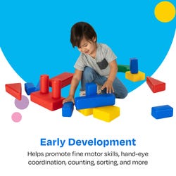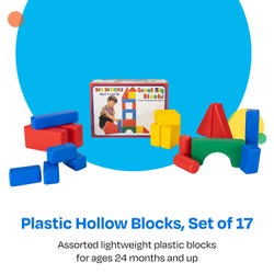 Childcraft® Hollow Plastic Blocks Set includes 17 sturdy, hollow blocks designed to foster open-ended exploration and hands-on learning. These lightweight blocks are ideal for classrooms, daycare centers, and homes. Crafted from durable plastic, they resist bending and cracking while remaining easy for young learners to lift and stack. The assorted shapes and colors enhance imaginative play, spatial awareness, and fine motor skills. Whether creating forts, towers, or 3D designs, children can enjoy hours of fun while developing important problem-solving and collaboration skills. These blocks are for ages 2 years and up.Features