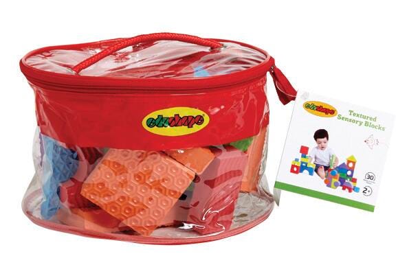 Build sensory and fine motor skills right in your playroom with Textured Foam Blocks. Assorted block shapes, sizes, and colors inspire children to build creatively and develop budding STEM skills. Added back textures, from wavy ripples and bumpy 3D protruding spots to spongy texture, encourage sensory recognition and tactile development. Distinctively textured front and back offer excellent visual and kinesthetic aids for sensory table games or therapy aids for children with special needs. Use each shape to build simple flat designs and up to more advanced 3D forts and figurines. Included storage bag (made of PVC and measures 8-1/2 W x 6 H inches) offers easy storage and cleanup of all 30 individual block pieces. All flexible foam blocks are 1 inch thick and come in assorted colors (red, yellow, blue, green, orange, and purple). Perfect for classic stacking fun to sensory development for ages 2 and up.