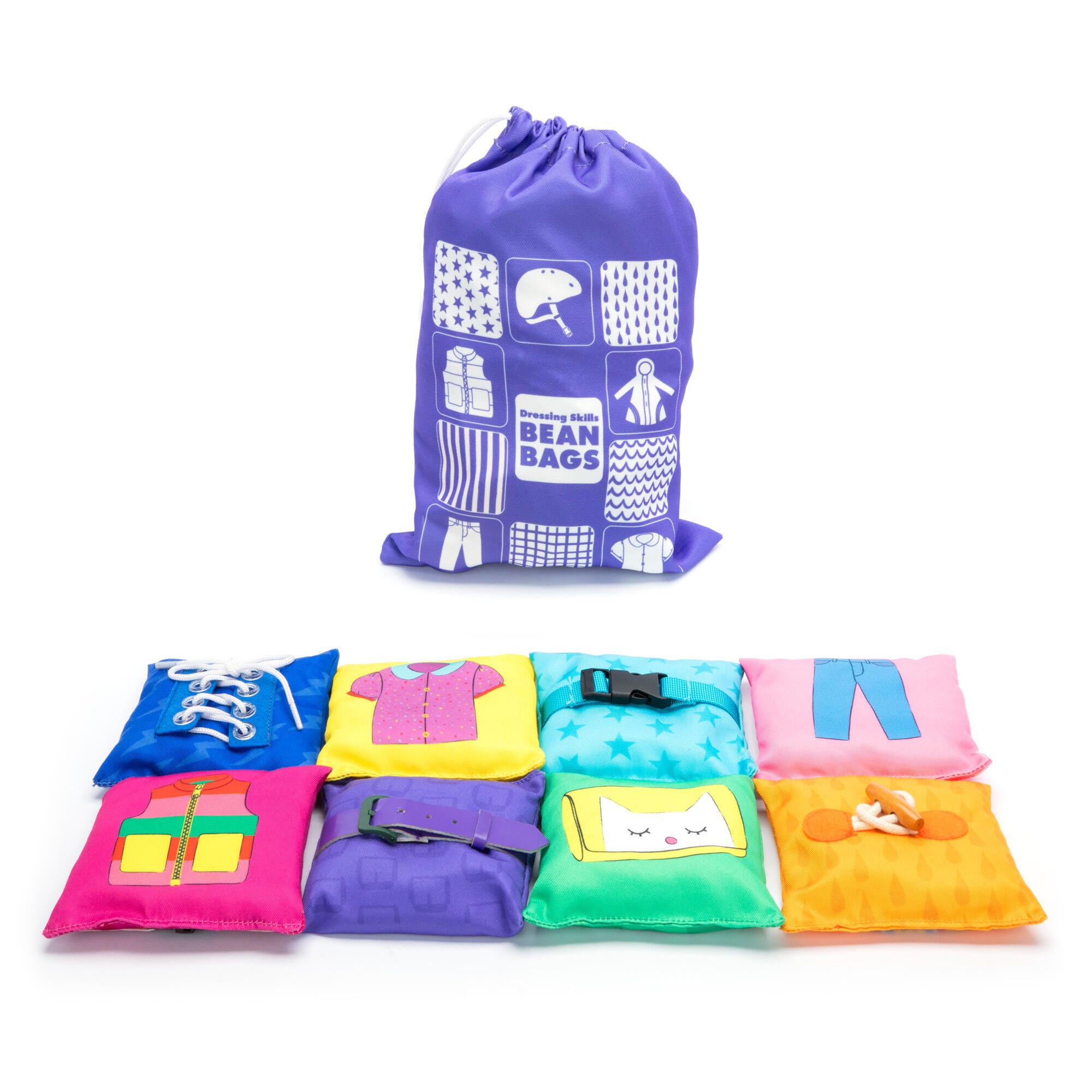These hands-on educational beanbags make learning to get dressed easy and fun for young children. Each bean bag features a common clothing fastener on one side, like zippers or laces, and an illustration of a clothing example on the other side, like a jacket or shoes! Each of the fasteners are designed to be hands-on and 3D for easy practice and manipulation. The dimensional design helps kids learn to dress themselves, an essential skill for preschool and kindergarten! Designed for ages four and older.Features