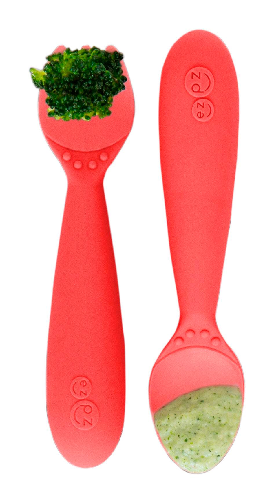 Learning to self-feed is an important developmental milestone, and the ezpz Mini Utensils are designed to help toddlers learn how to eat with a spoon (scooping) and fork (piercing). The Mini Spoon and Fork are the most functional, developmentally appropriate toddler utensils on the market. Sensory bumps and raised rim provide sensory awareness. Non-slip grip and short, fat, round handle make grasping more successful. Utensils are made with food grade silicone and nylon (BPA, BPS, PVS, phthalate and latex free) and are Dishwasher safe. Dimensions of spoon and fork are 4-3/8 L x 1 W inches. Appropriate for ages 12 months and up.