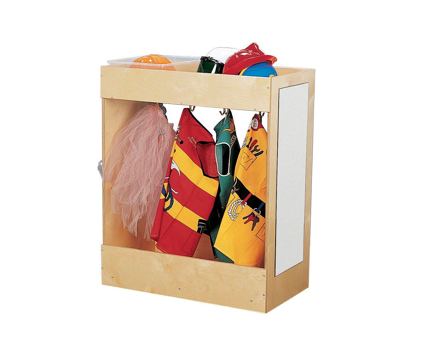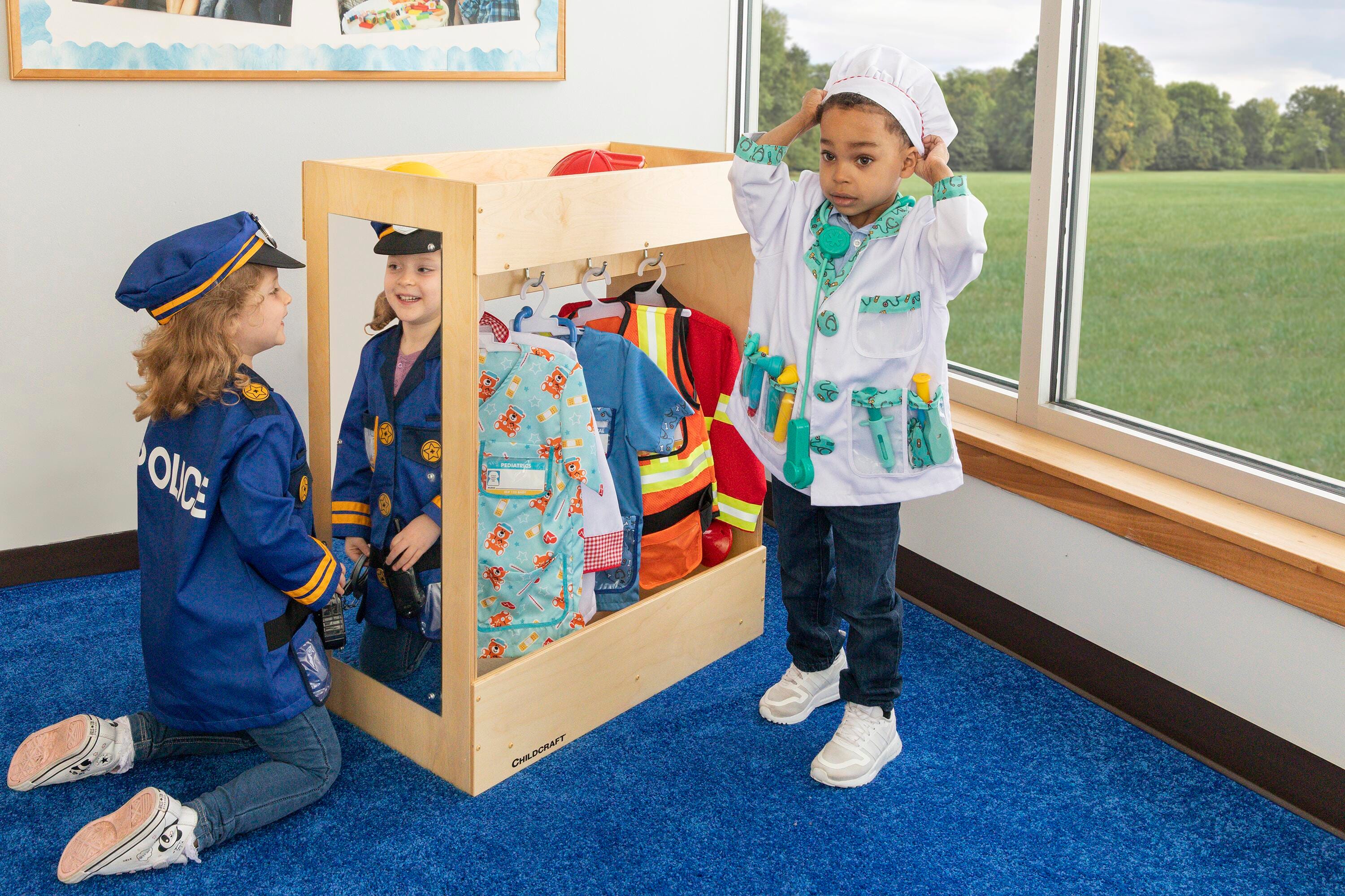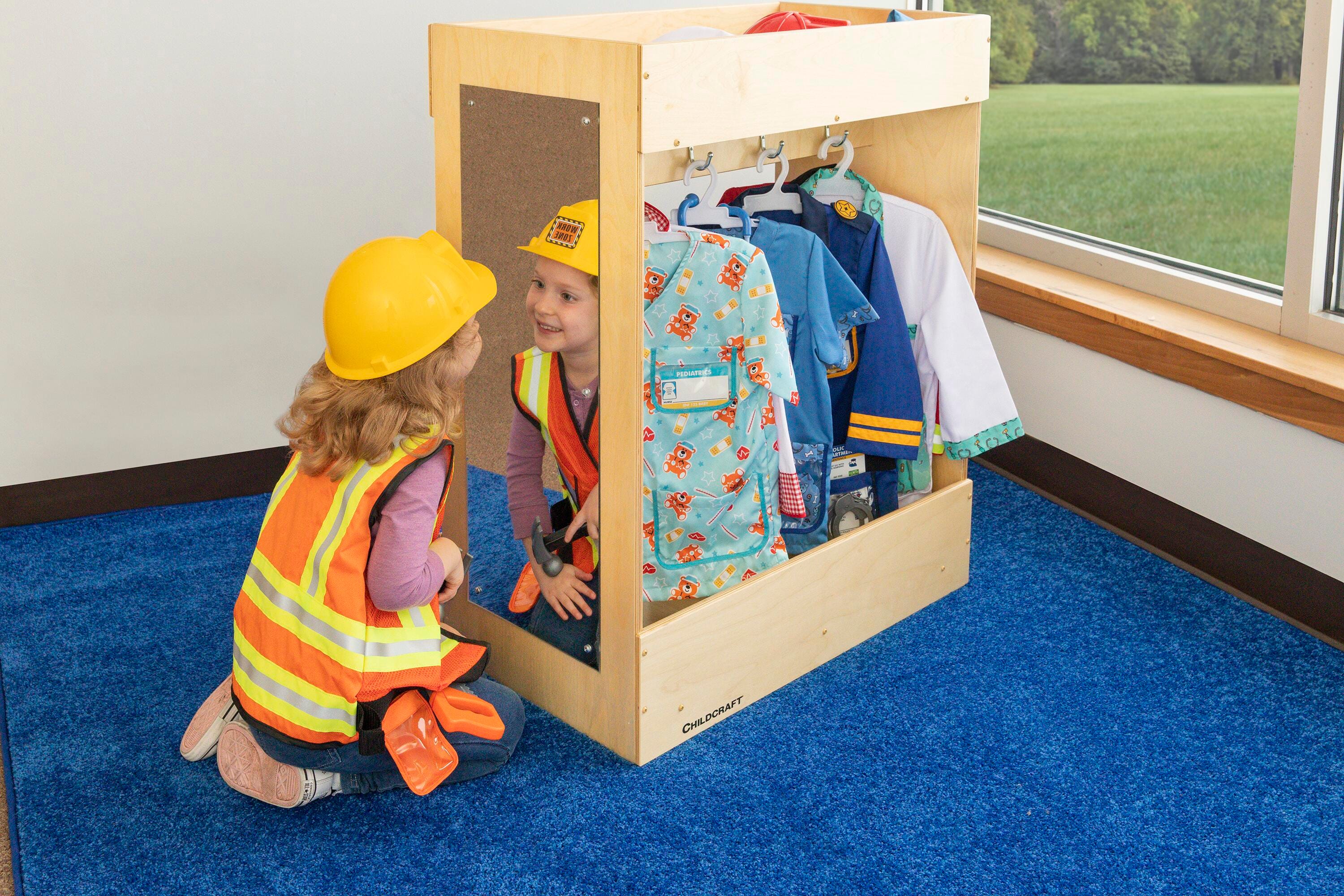 The Childcraft® Junior Dress-Up Storage Unit offers an accessible solution for organizing costumes and accessories in classrooms, childcare centers, or home playrooms. Made from high-quality birch veneer, this compact dress-up center features four sturdy coat hooks, a shatterproof acrylic mirror, and storage wells to hold hats, shoes, and more. The open closet allows children to independently access dress-up items and see themselves in the plexiglass mirror while playing. Comes fully assembled. Measures 29-3/4 W x 16 D x 35-7/8 H inches.Features