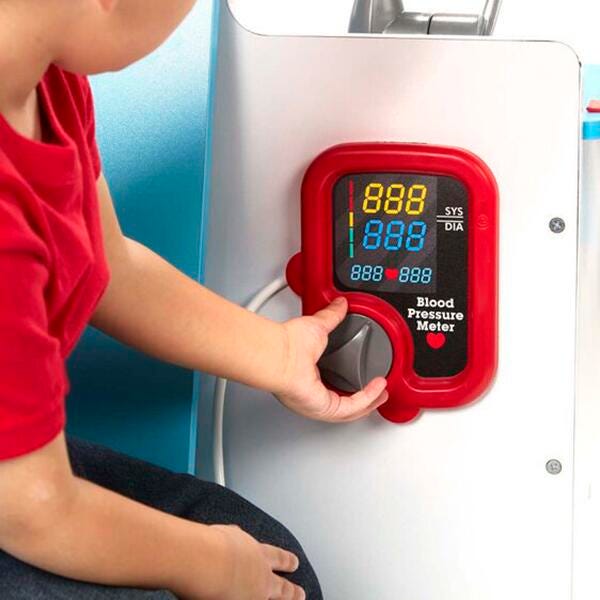 Includes blood pressure monitor with adjustable cuff, 2 X-rays to display, scale with movable weight, adjustable height bar, eye chart, clock with movable hands, movable tool hooks and holders, sink, sanitizer pump, reversible diploma/window card
