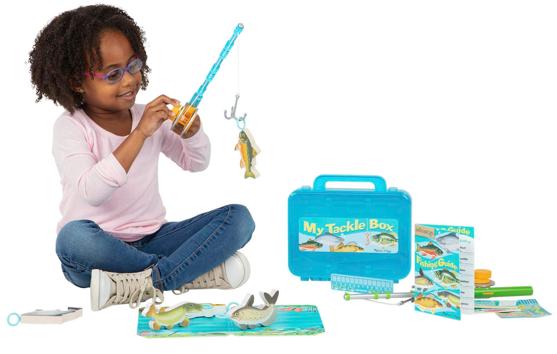 - Add to the fishing experience with fish guide and activity cards, ruler for measuring catches, double-sided mat for warm or cold weather fishing, durable tackle box to store supplies, collectible medallion