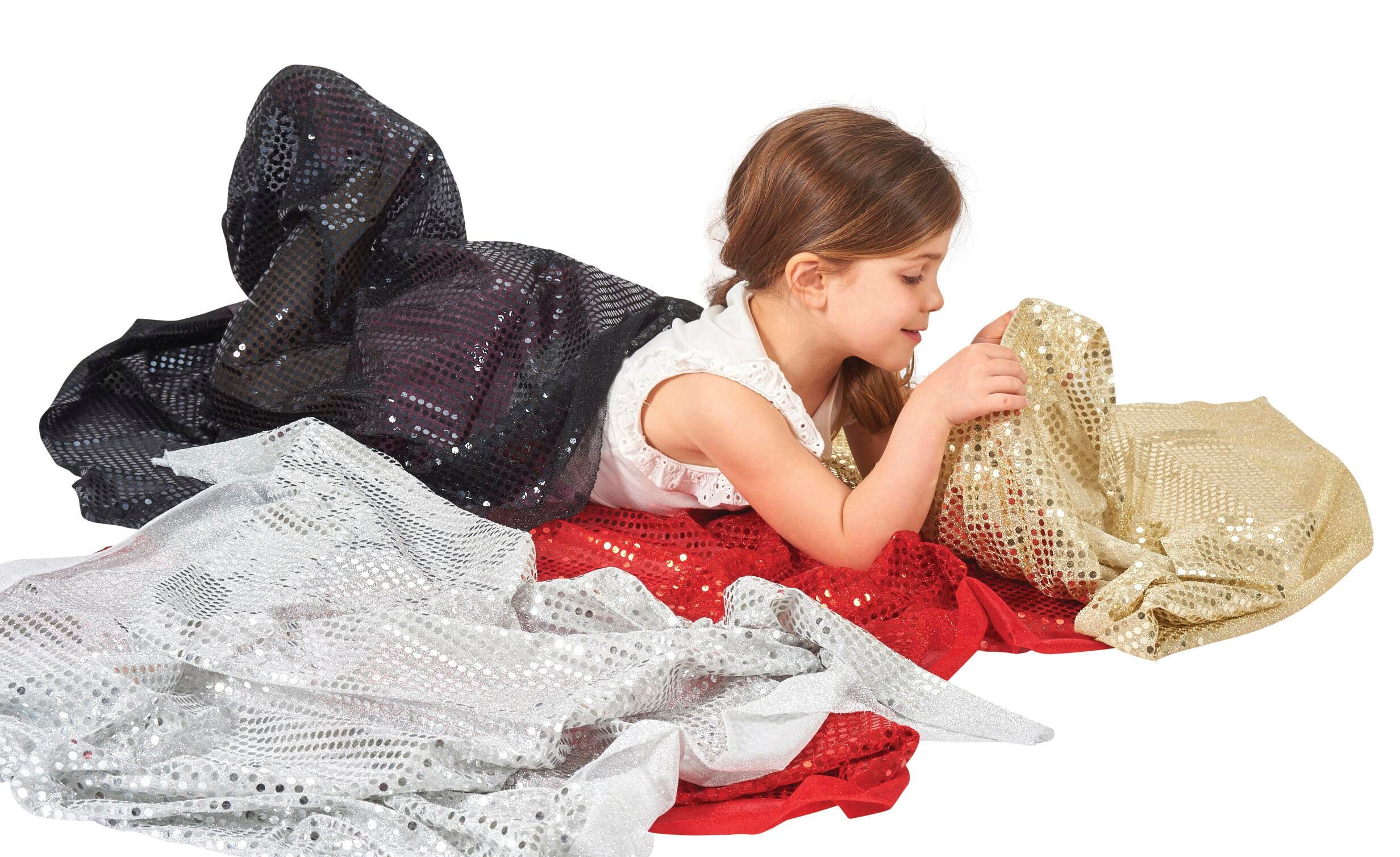 Sequins add sparkle to creative play! Four pieces of sequined, lightweight material will take imagination to the next level. Each piece is soft, sparkly and bright and comes in four colors: red, gold, silver and black. The possibilities are endless – use for role play, drape over some chairs to create a quiet space, use to enhance music and movement. Or simply use for textural and visual stimulation. Each piece measures 3-1/4 x 3-1/4 feet.Features