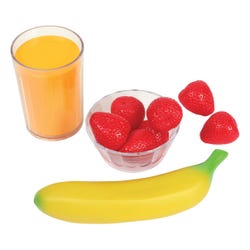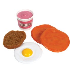 Your students will love starting their day with a healthy helping of fun breakfast toys! Your role players will enjoy deciding on healthy a.m. choices (like fruits, dairy, pancake grain, plus milk and juice) with realistic (yet surprisingly durable plastic) breakfast foods and beverages. All are sized approximately to the real serving sizes. Set also includes a sturdy shopping basket (sized at 10-3/4 L x 5-1/4 W x 8-1/2 H inches) for easy transportation, an Activity Guide, and Teaching Guide for educational and fun ideas. Complement this Breakfast Play Set with the other Healthy Lunch and Dinner Sets for p.m. options and even more delicious fun! Safe for ages 3 and up.Features