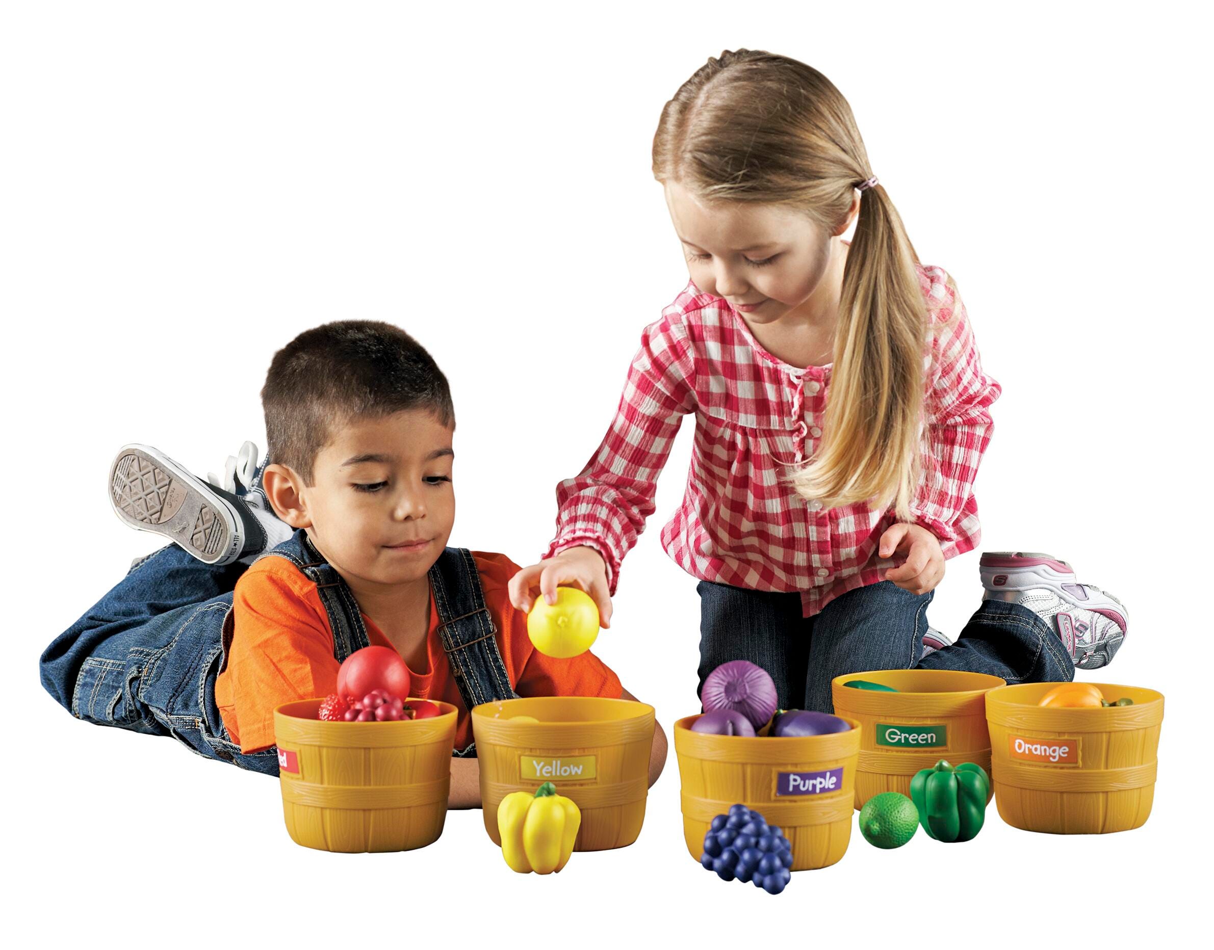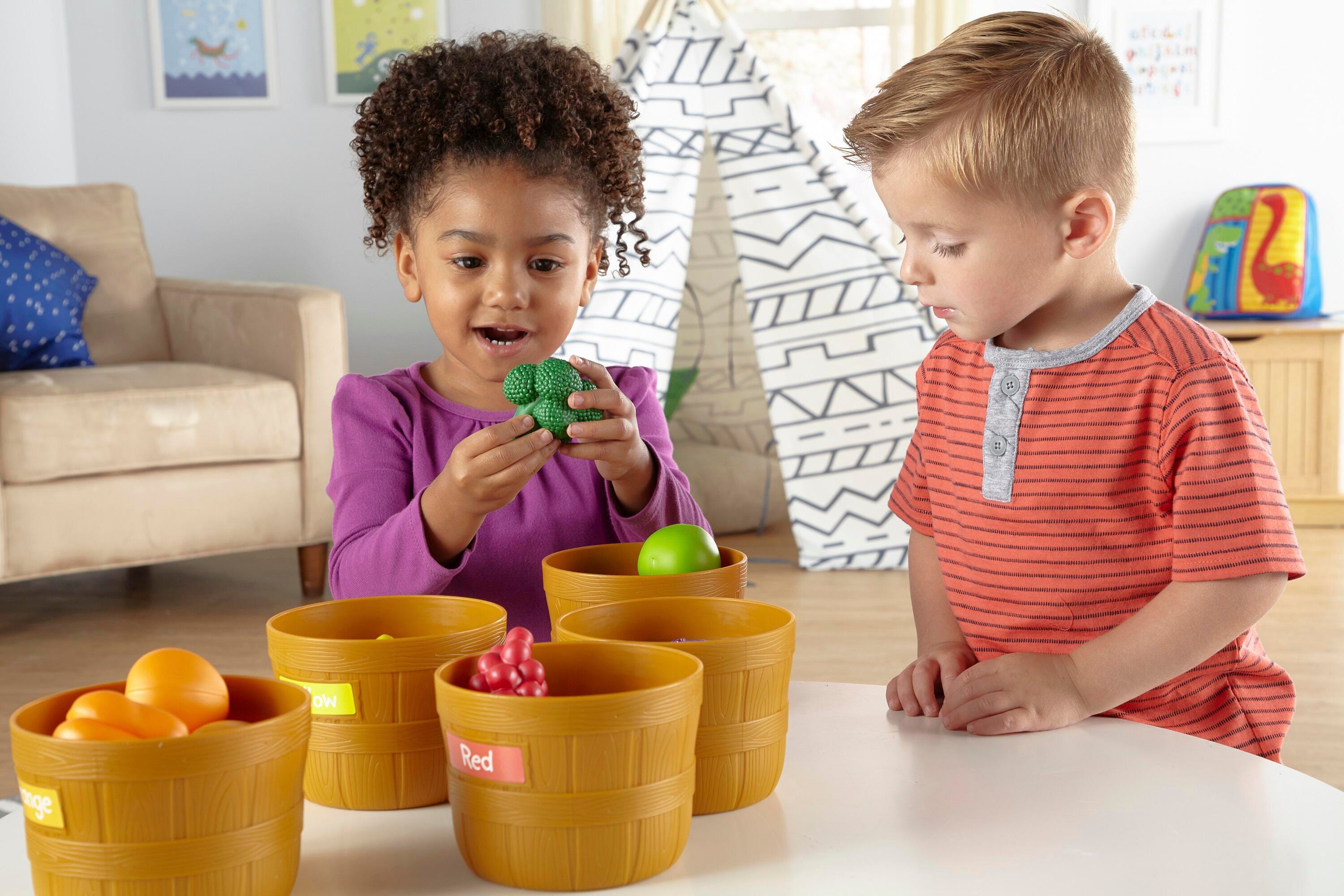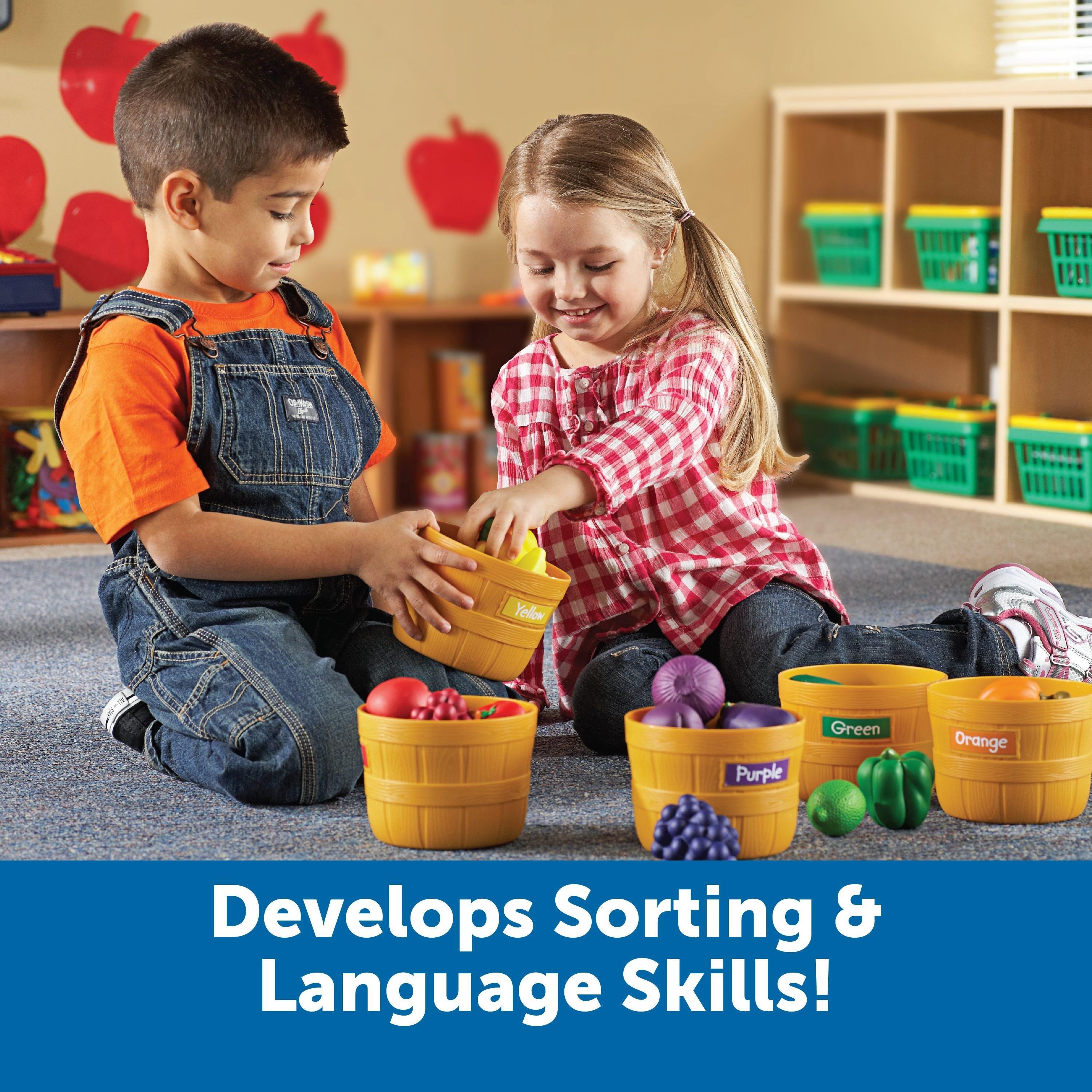 Learning Resources helps children develop color recognition and sorting skills with bushels of realistic, relationally sized produce. Includes activity guide, 25 foods, and 5 baskets with stickers for labeling. Baskets measures 5-1/2 D x 4 H inches. Created for ages 18 months and up.