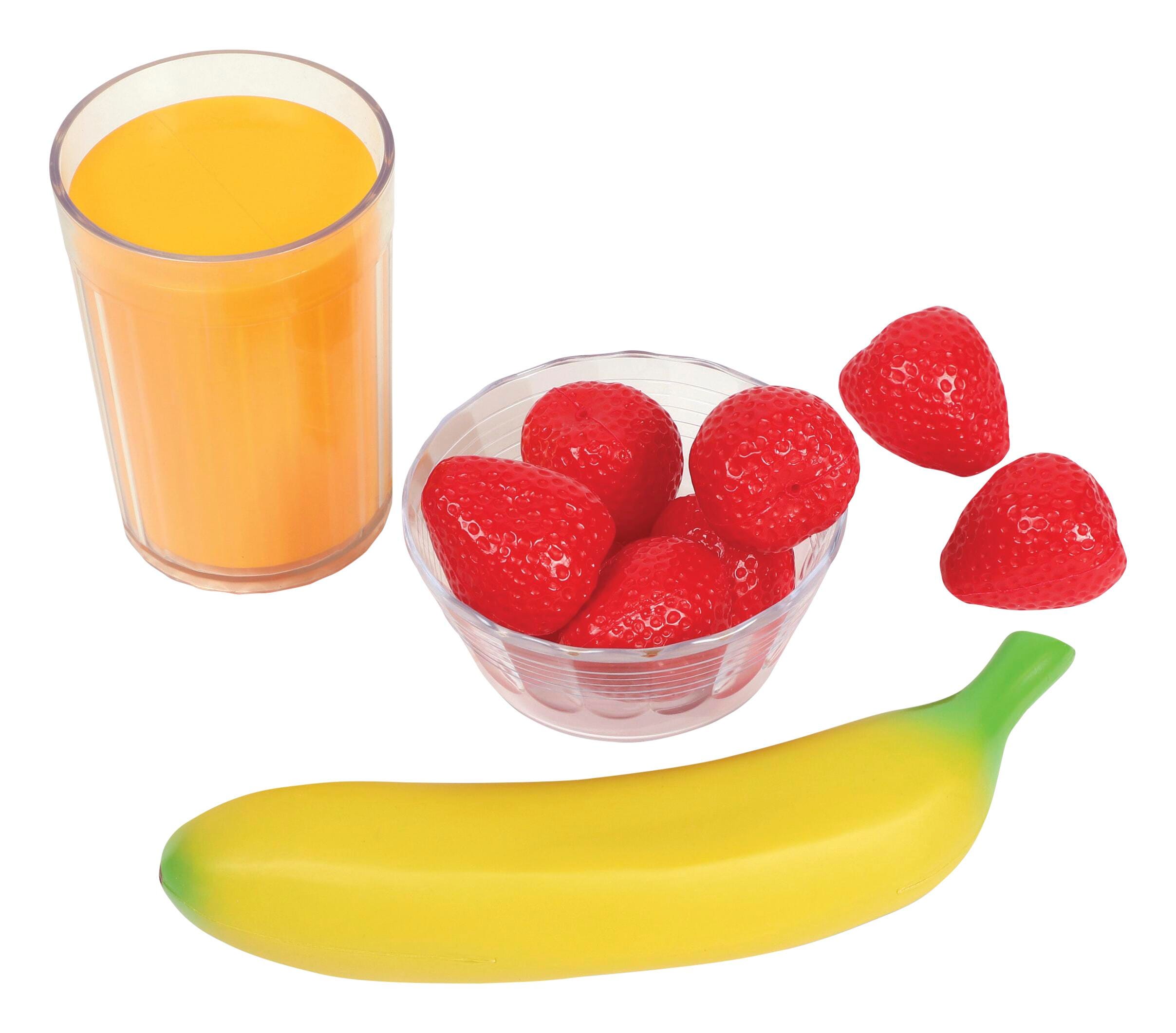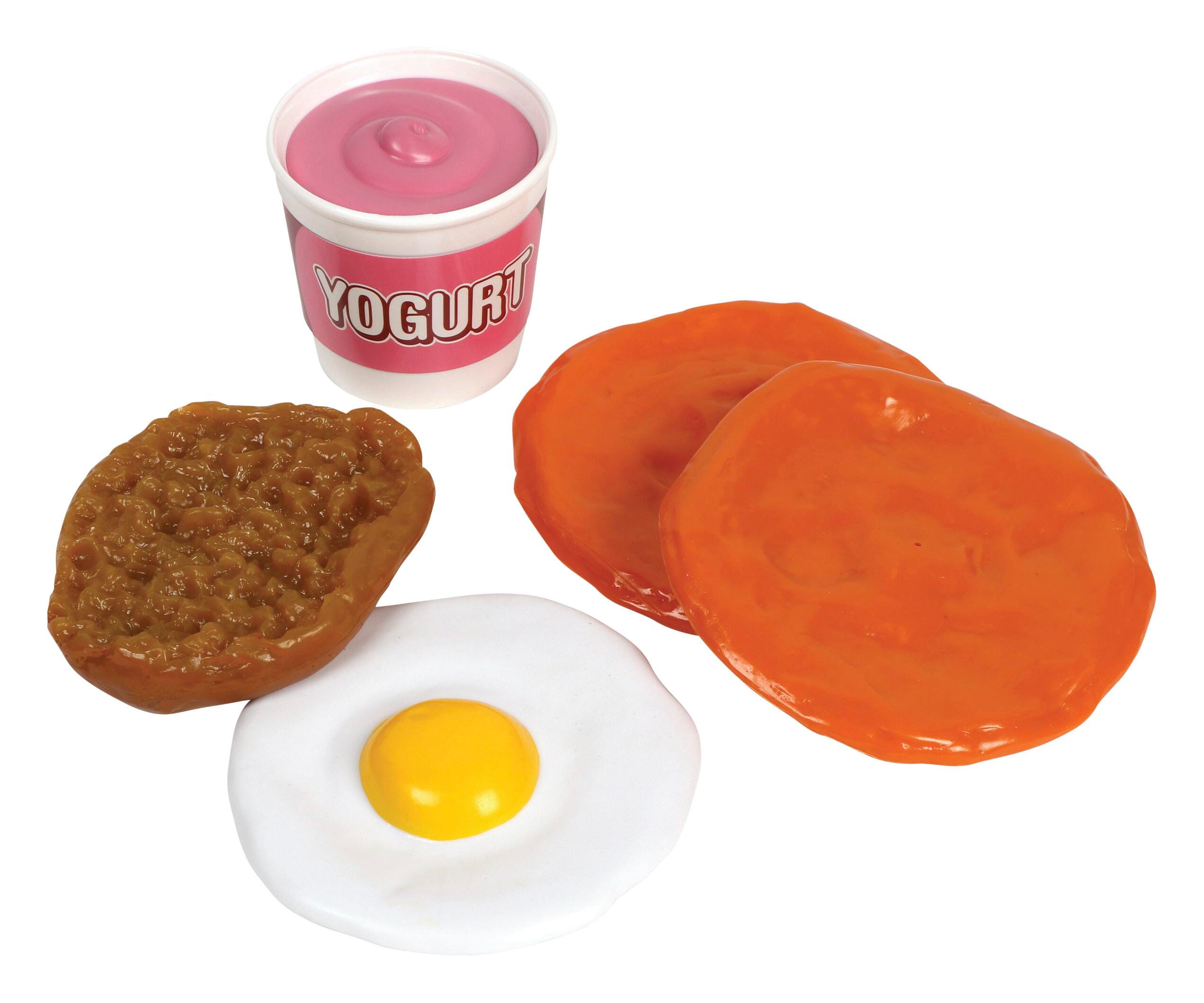 Your students will love starting their day with a healthy helping of fun breakfast toys! Your role players will enjoy deciding on healthy a.m. choices (like fruits, dairy, pancake grain, plus milk and juice) with realistic (yet surprisingly durable plastic) breakfast foods and beverages. All are sized approximately to the real serving sizes. Set also includes a sturdy shopping basket (sized at 10-3/4 L x 5-1/4 W x 8-1/2 H inches) for easy transportation, an Activity Guide, and Teaching Guide for educational and fun ideas. Complement this Breakfast Play Set with the other Healthy Lunch and Dinner Sets for p.m. options and even more delicious fun! Safe for ages 3 and up.Features