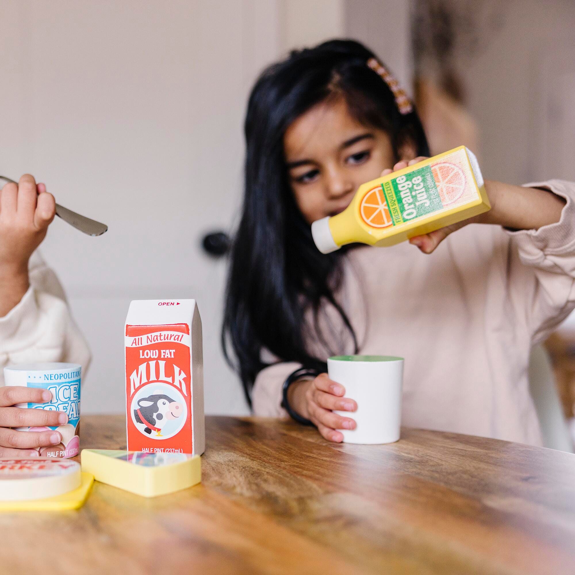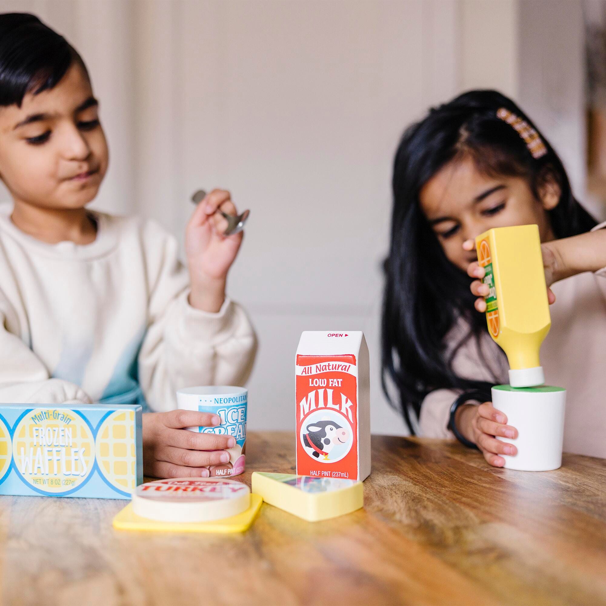 Fridge play food set for children features classic meal and condiment essentials for pretend breakfast, lunch, and dinner meals