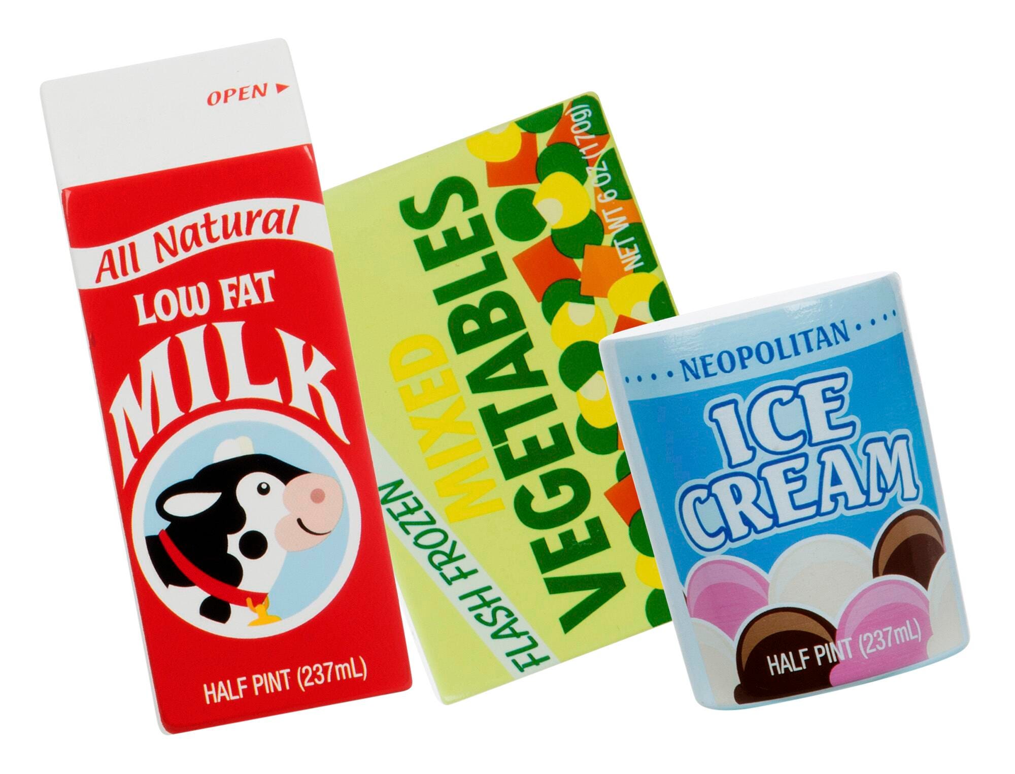 Satisfy a child's hunger for imaginative play. This set of 8 wooden fridge food pieces add even more delicious food play fun to children's existing dining accessories. Pieces include everything from dairy essentials to morning must-haves, healthy side helpings, and a little dessert as a treat. Promote even more learning when you ask toddler cooks to decide whether a particular food/drink item goes in the freezer or the fridge! Set designed for ages 3 and up.