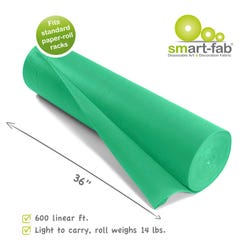 Smart-Fab Non-Woven Fabric Roll measuring 36 in x 600 ft in grass green is an innovative artistic and educational medium. It's bold, brilliant colors are in the material itself, so they won't fade and look great from either side. Soft and pliable yet strong and durable, smart-fab won't rip, fray or wear out, yet it's easy to cut, fold, twist, crimp, ruffle and glue. The cloth-like texture makes it pleasant to handle, yet firm enough to be used in 3-D creations and it is great for outdoor use. It is water and wear resistant but can be easily colored with paints, crayons, markers and all popular art media. Roll is also convenient to store, supplied in rolls that fit standard paper roll racks.Features